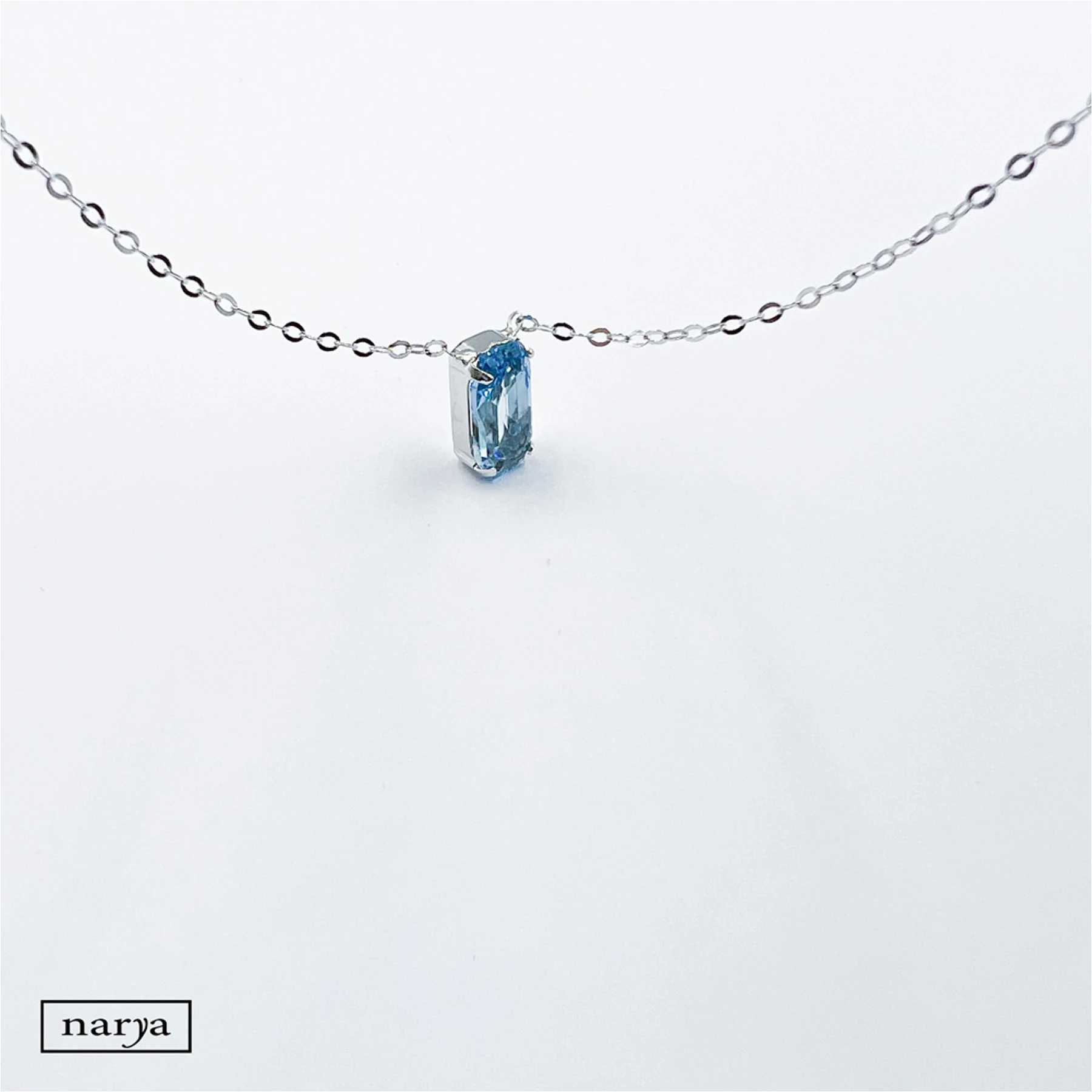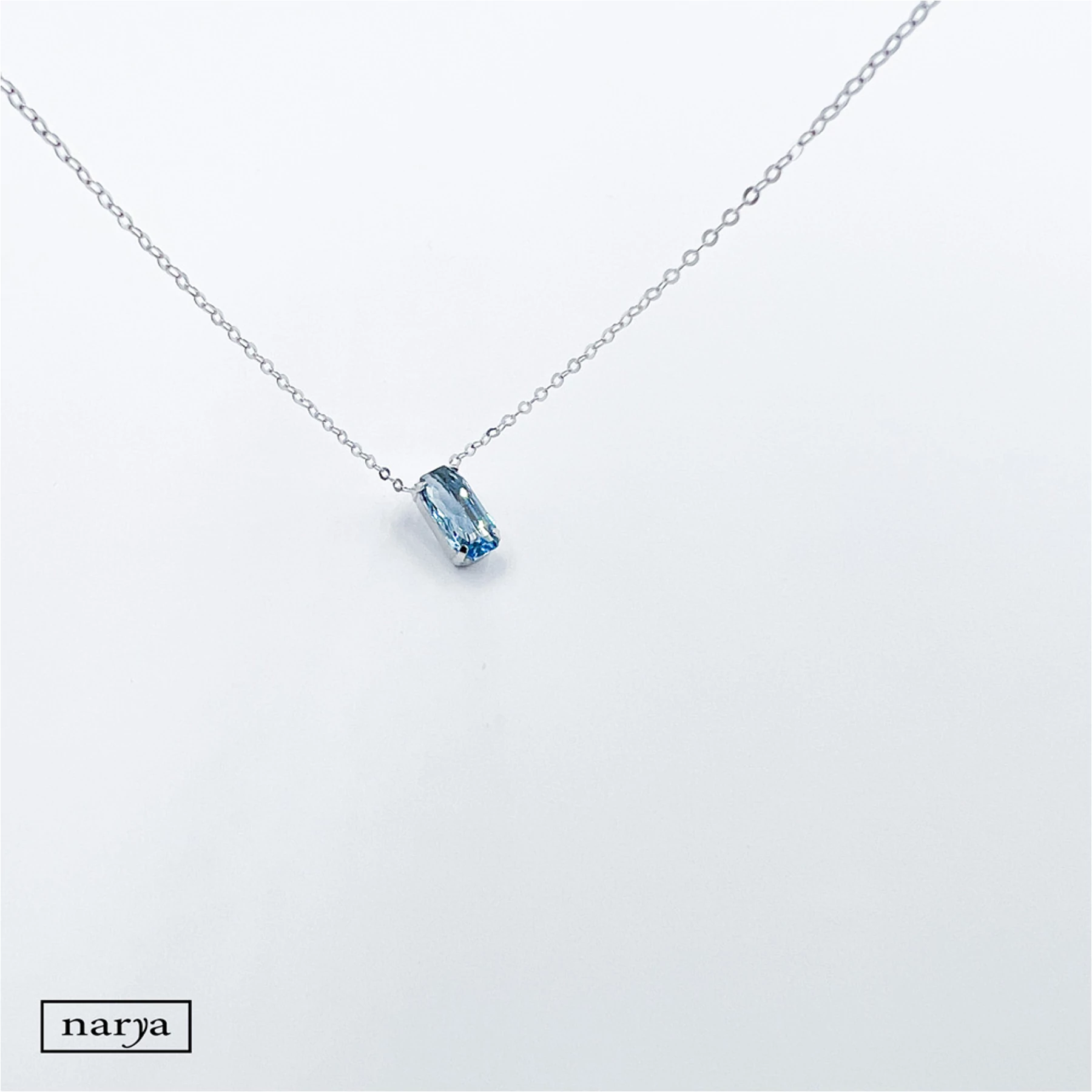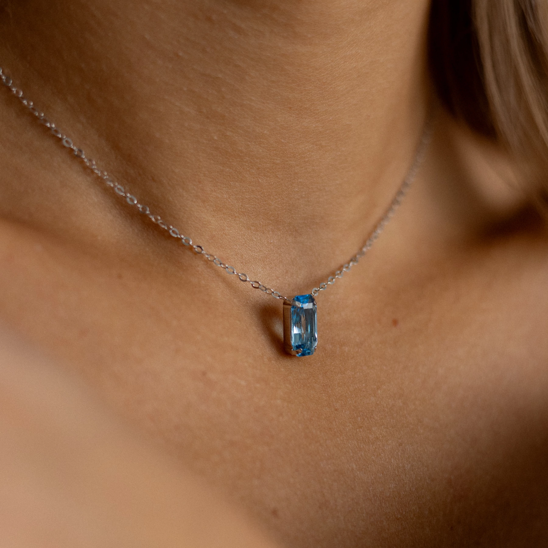 Ezüst Abiát ékszerünk egy igazán különleges, világos kék színű swarovski kristállyal díszített, ródiumozott nyaklánc. Az ezüst nyaklánc különlegessége, hogy a swarovski kristálynak téglalap alakja van, a nyaklánc láncszemei pedig pici karikákból állnak, melyek egymásba kapaszkodnak.
