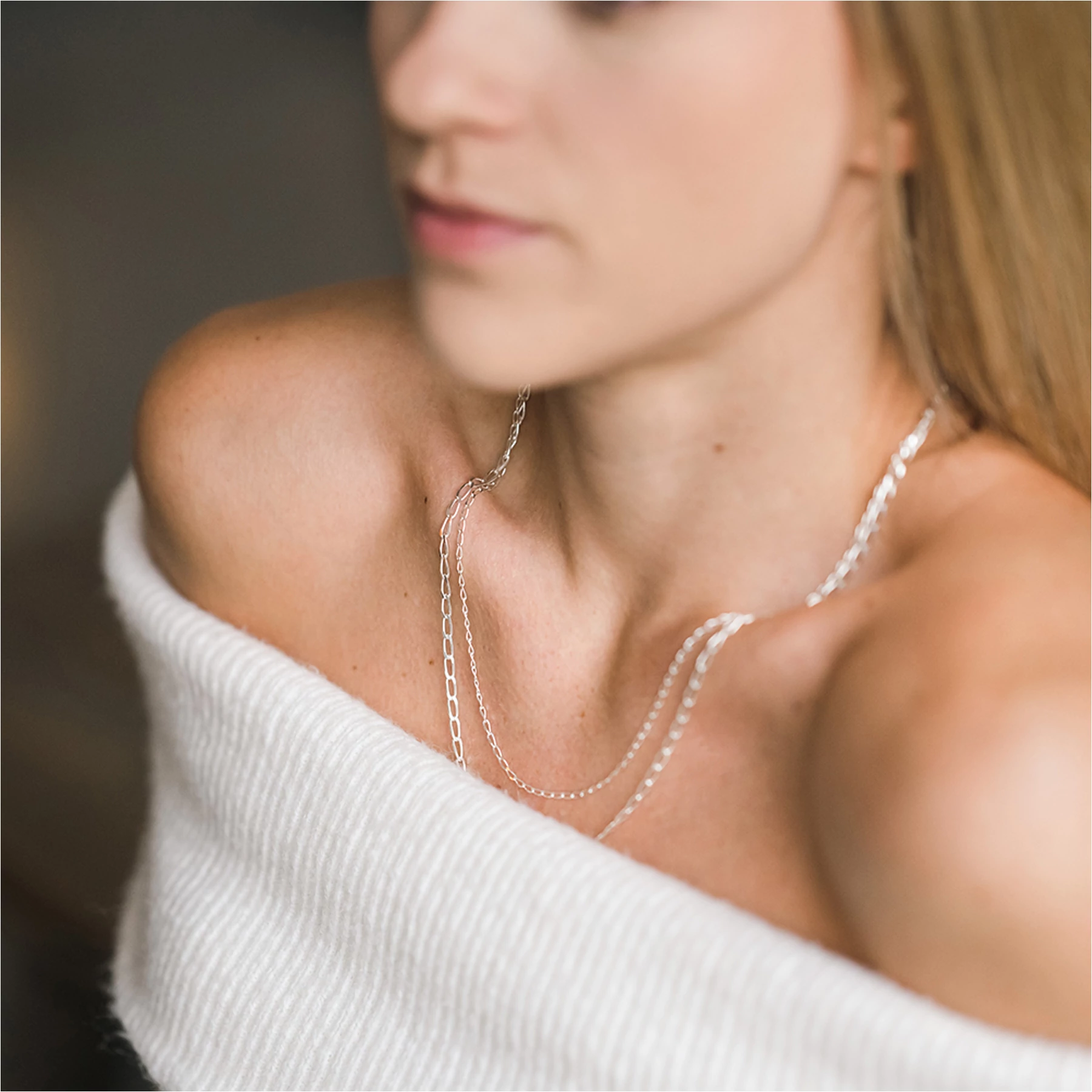 Abigélke ékszerünk egy ezüst nyaklánc, mely több kisebb láncszemből áll. Visszafogott stílusa miatt könnyen kombinálható más ékszerekkel és tökéletes viselet a mindennapokra. A nyaklánc hosszúsága 50 cm.