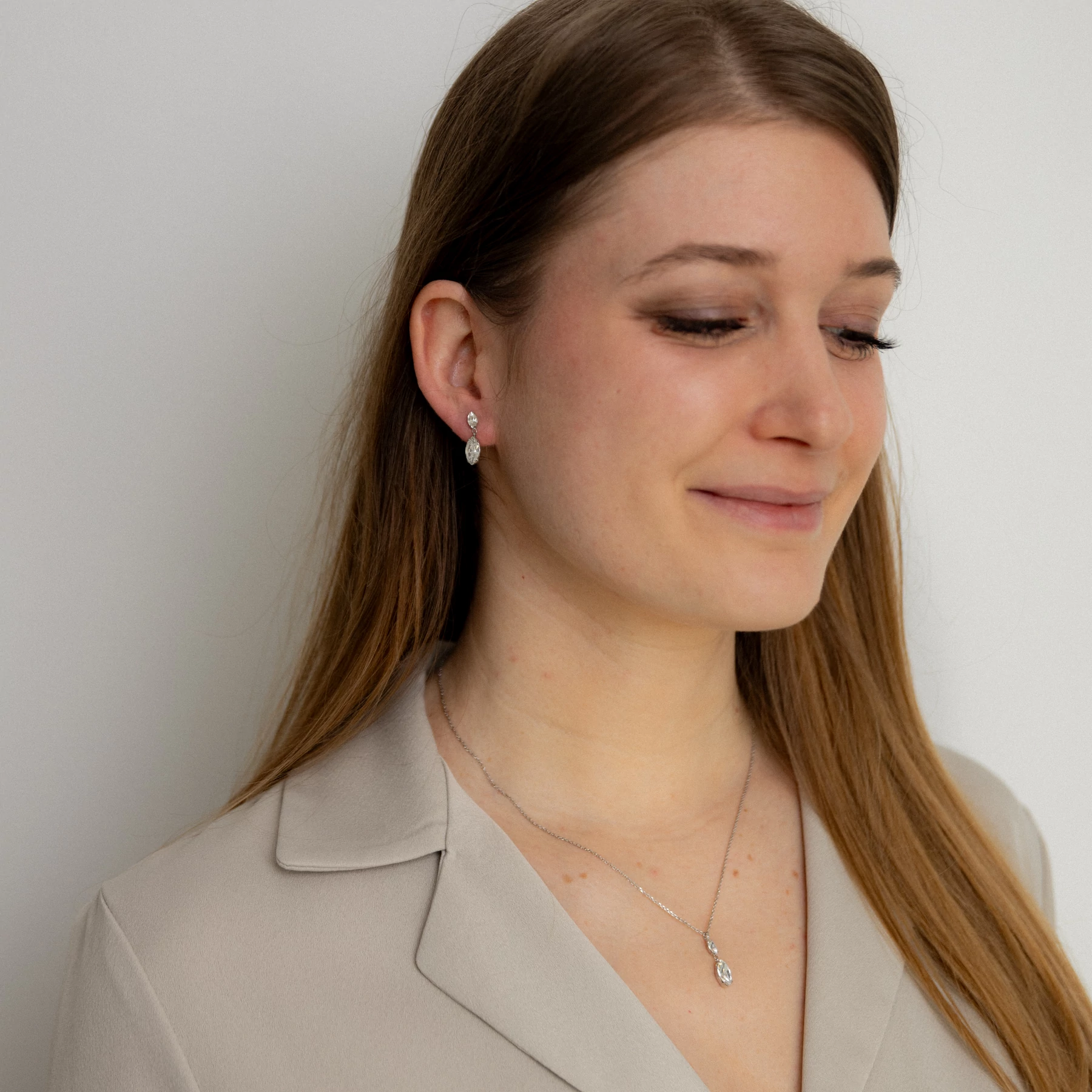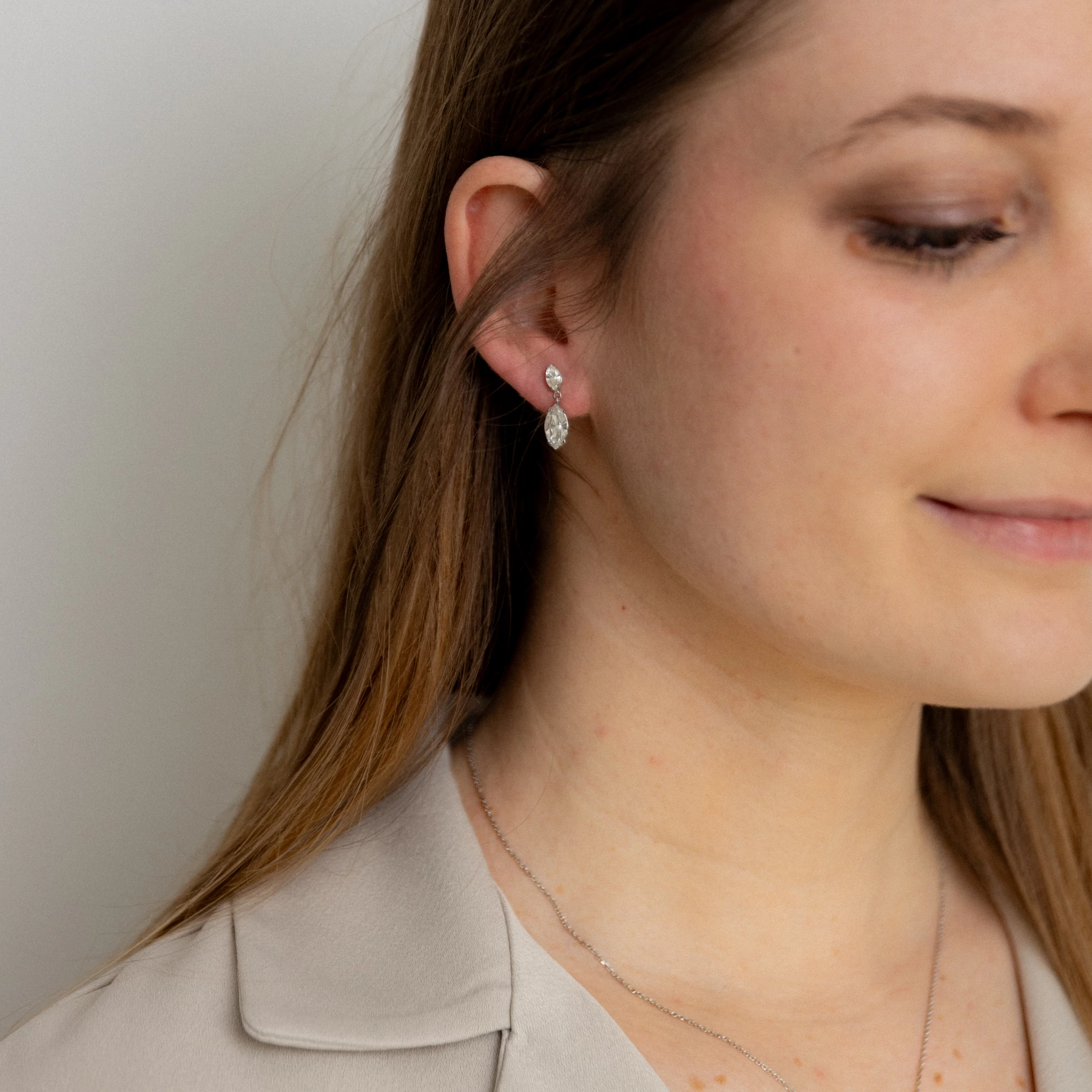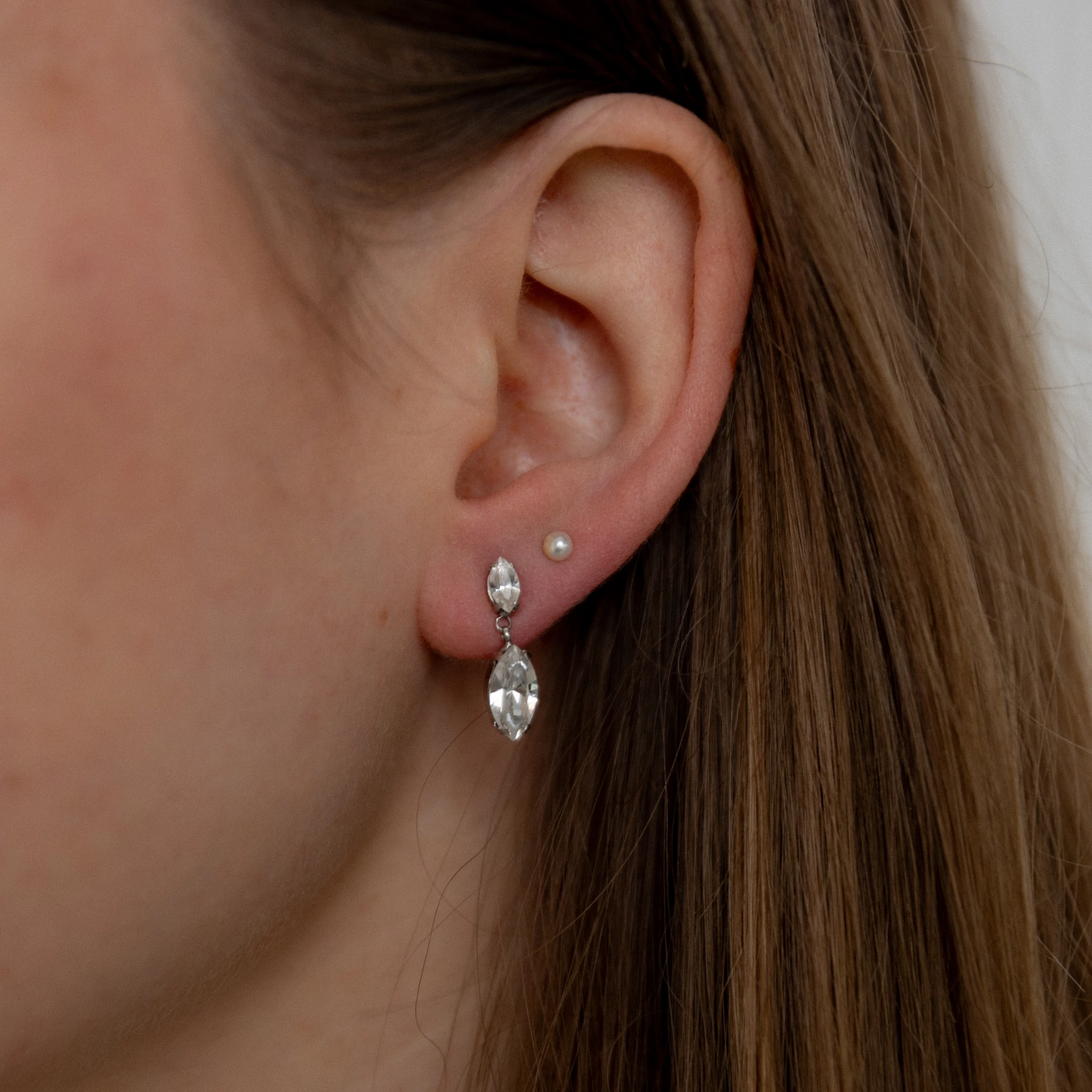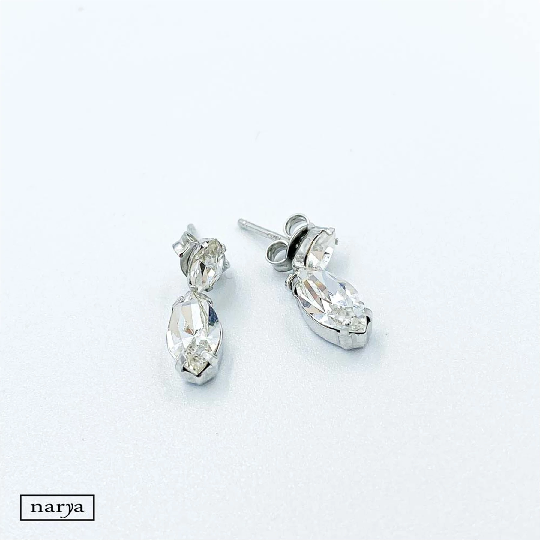 Ezüst, ródiumozott, picit lógós, swarovski kristályokkal díszített, stekkeres rögzítésű fólbevaló.