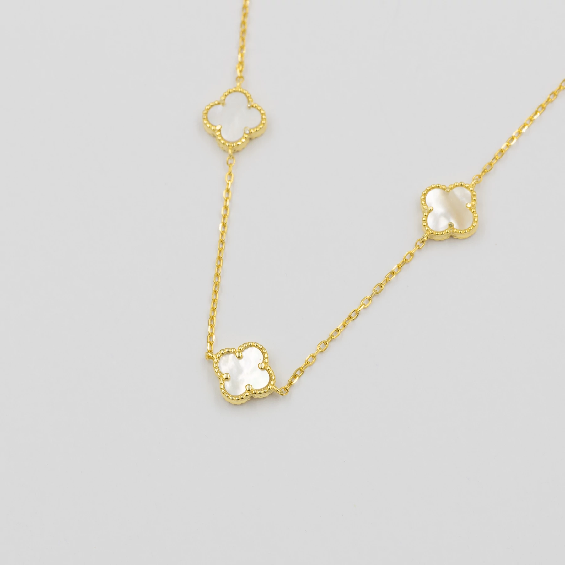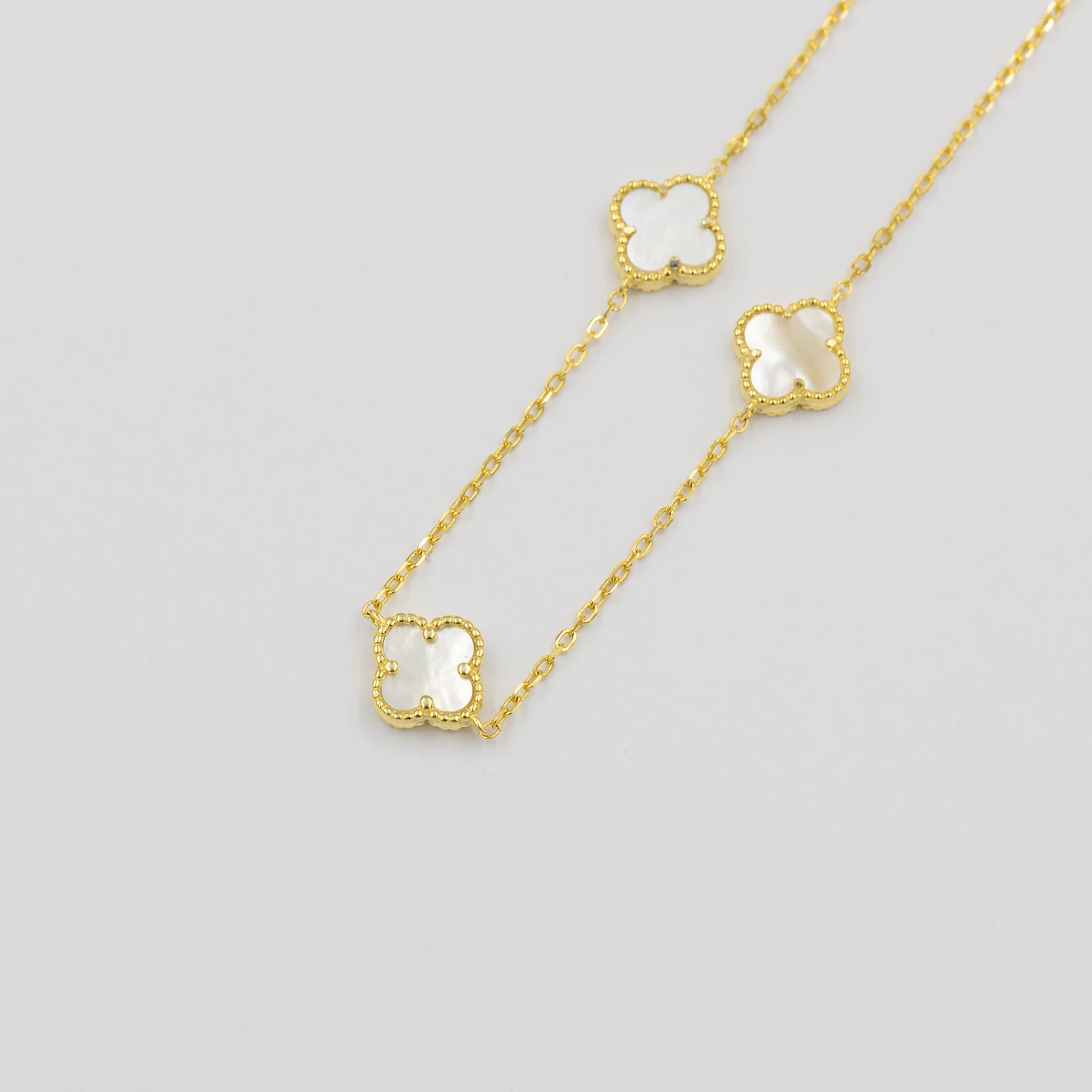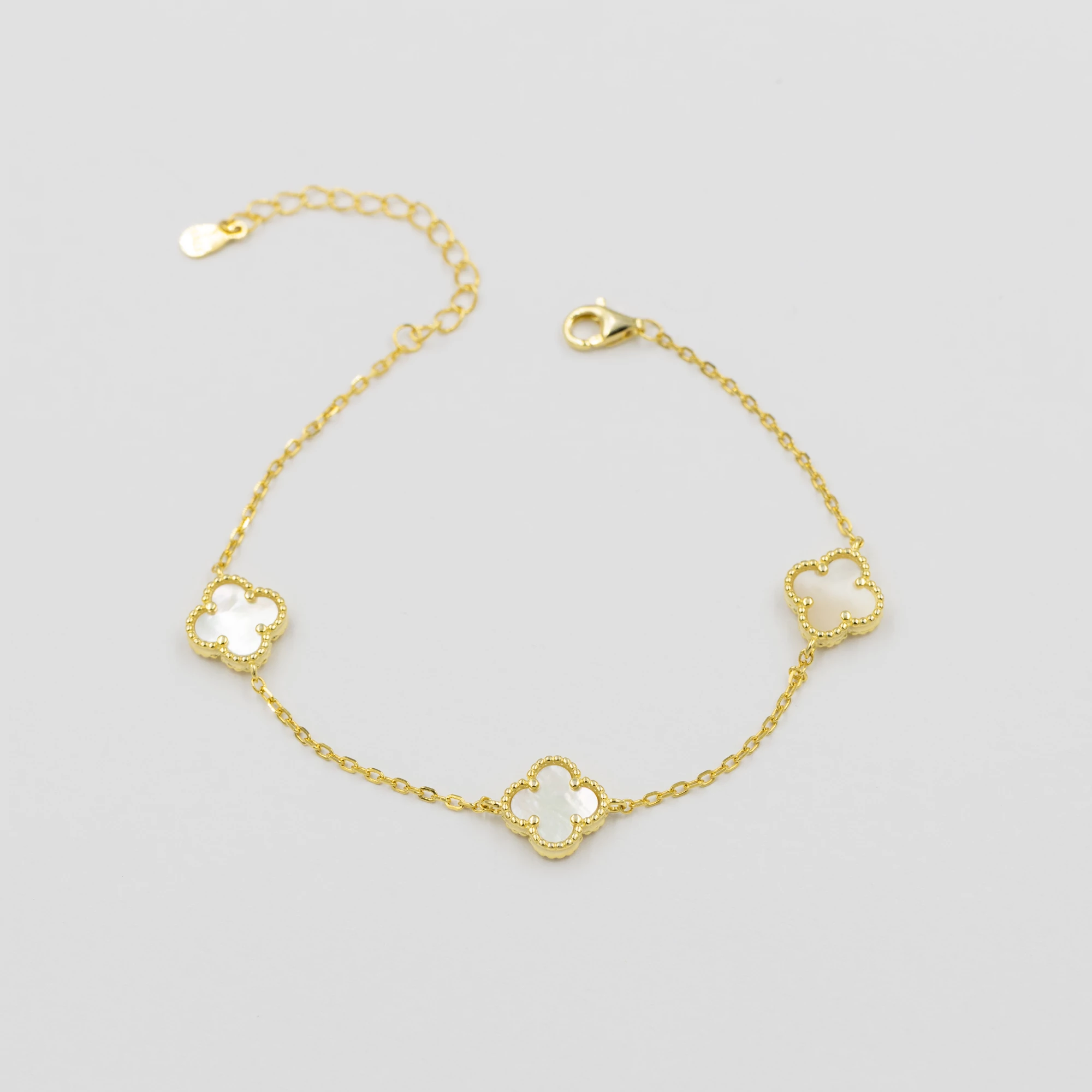 Adriána ezüst karkötőnk egy aranyozott ékszer, melyet a rajta található három aranyozott és gyöngyház díszítésű medálok teszik igazán különlegessé. Ezüst karkötőnkön a medálok négylevelű lóhere formát ábrázolnak.