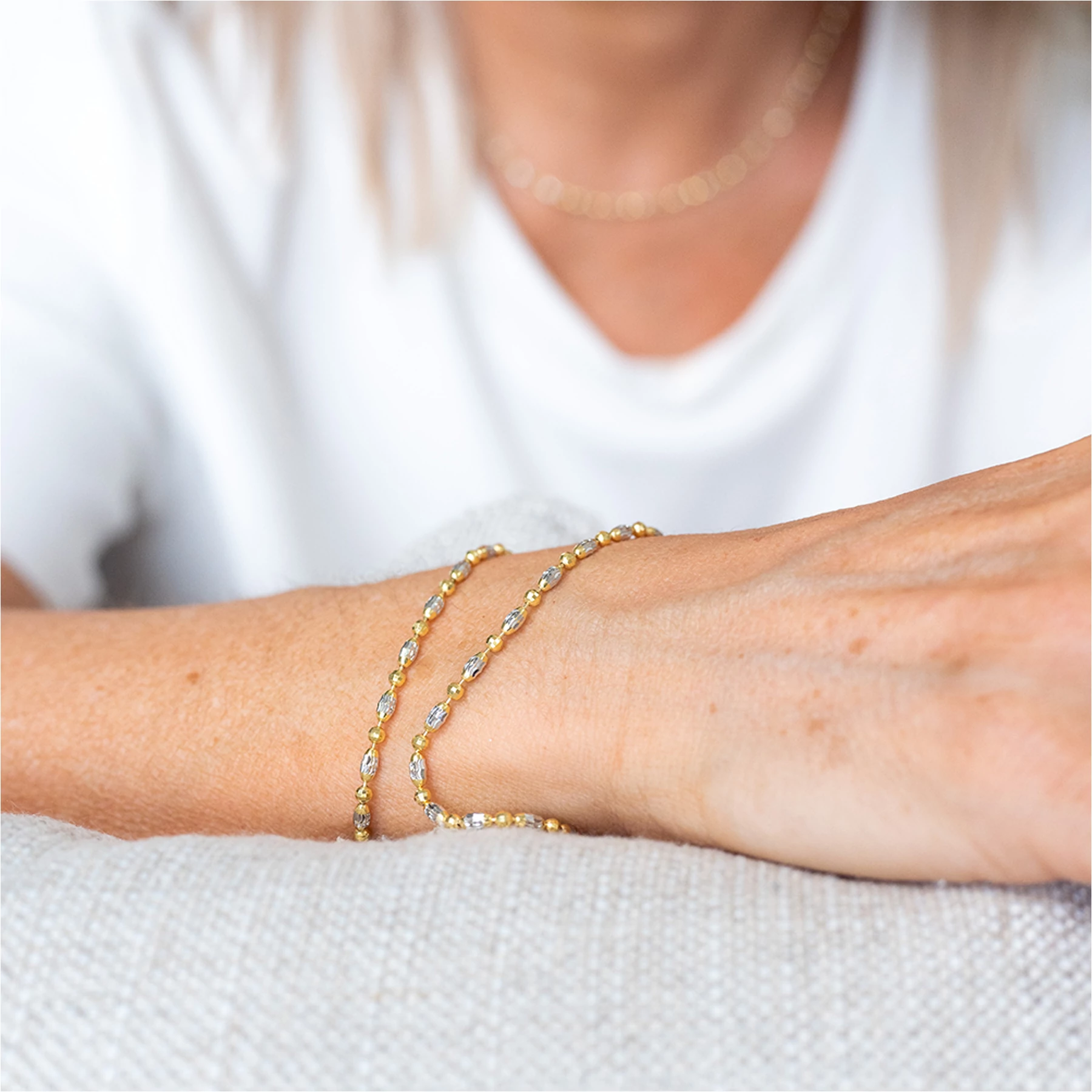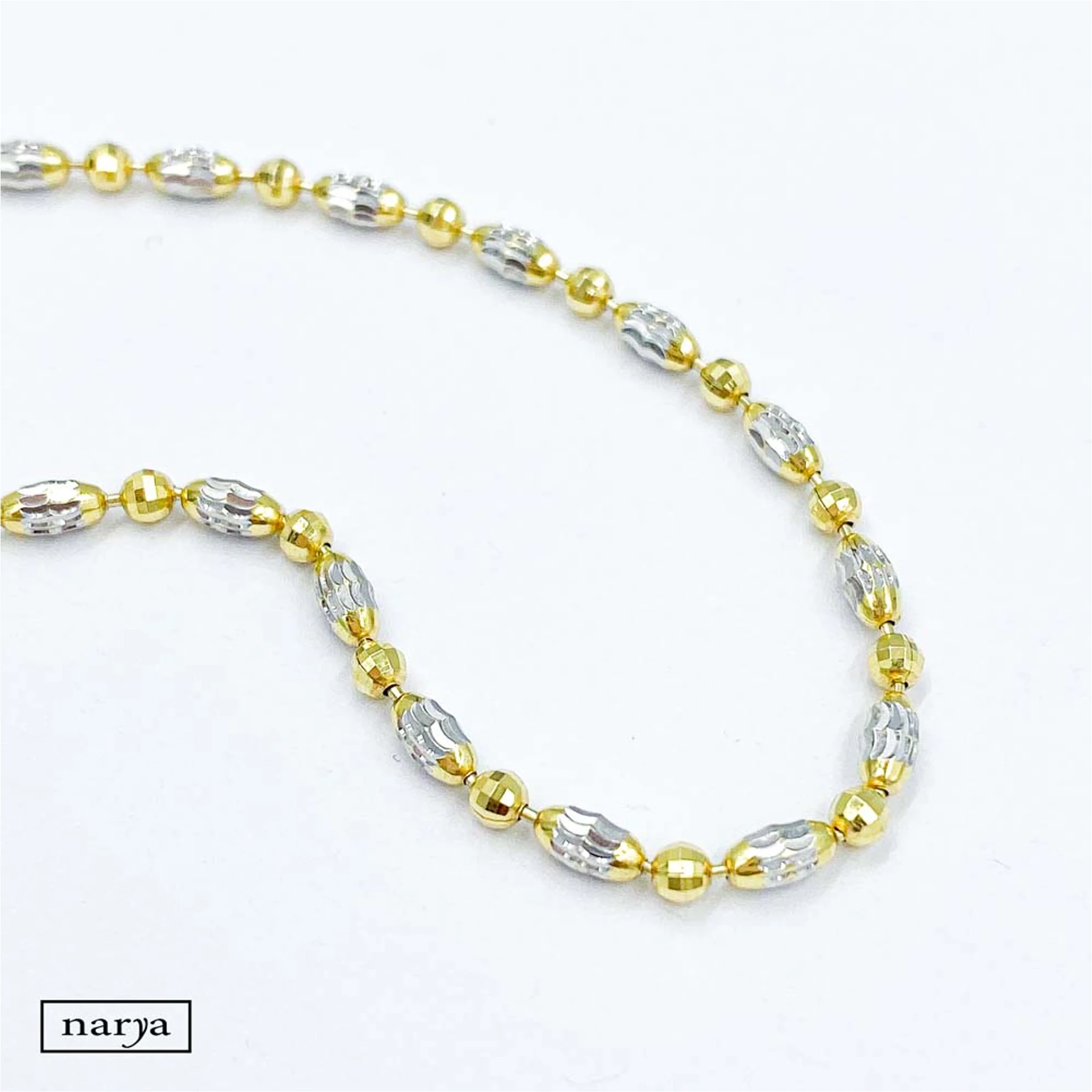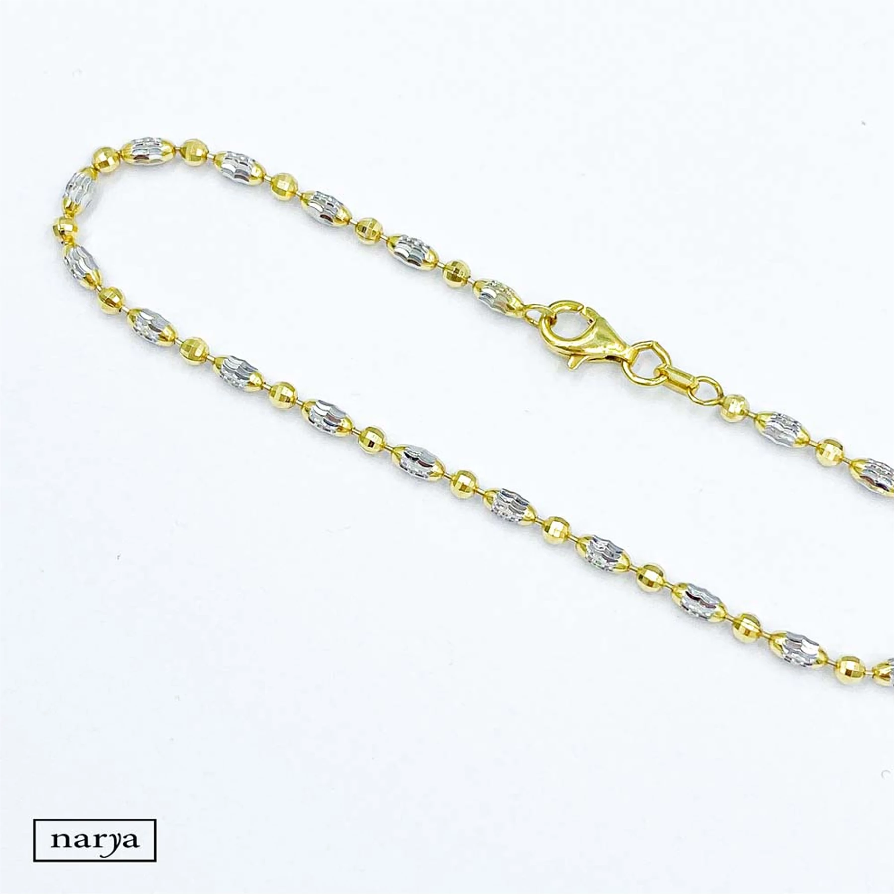 Anadra ezüst karkötőnk kétszínű, aranyozott és ródiumozott bevonattal ellátott, 925 ezrelékes finomságú ezüst karlánc. Az ezüst  karlánc különböző alakú és nagyságú, speciálisan csiszolt gömbökből áll.