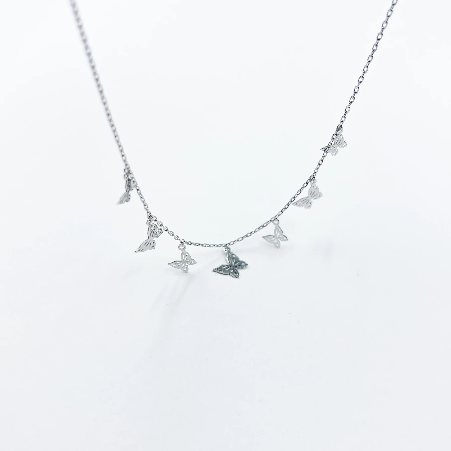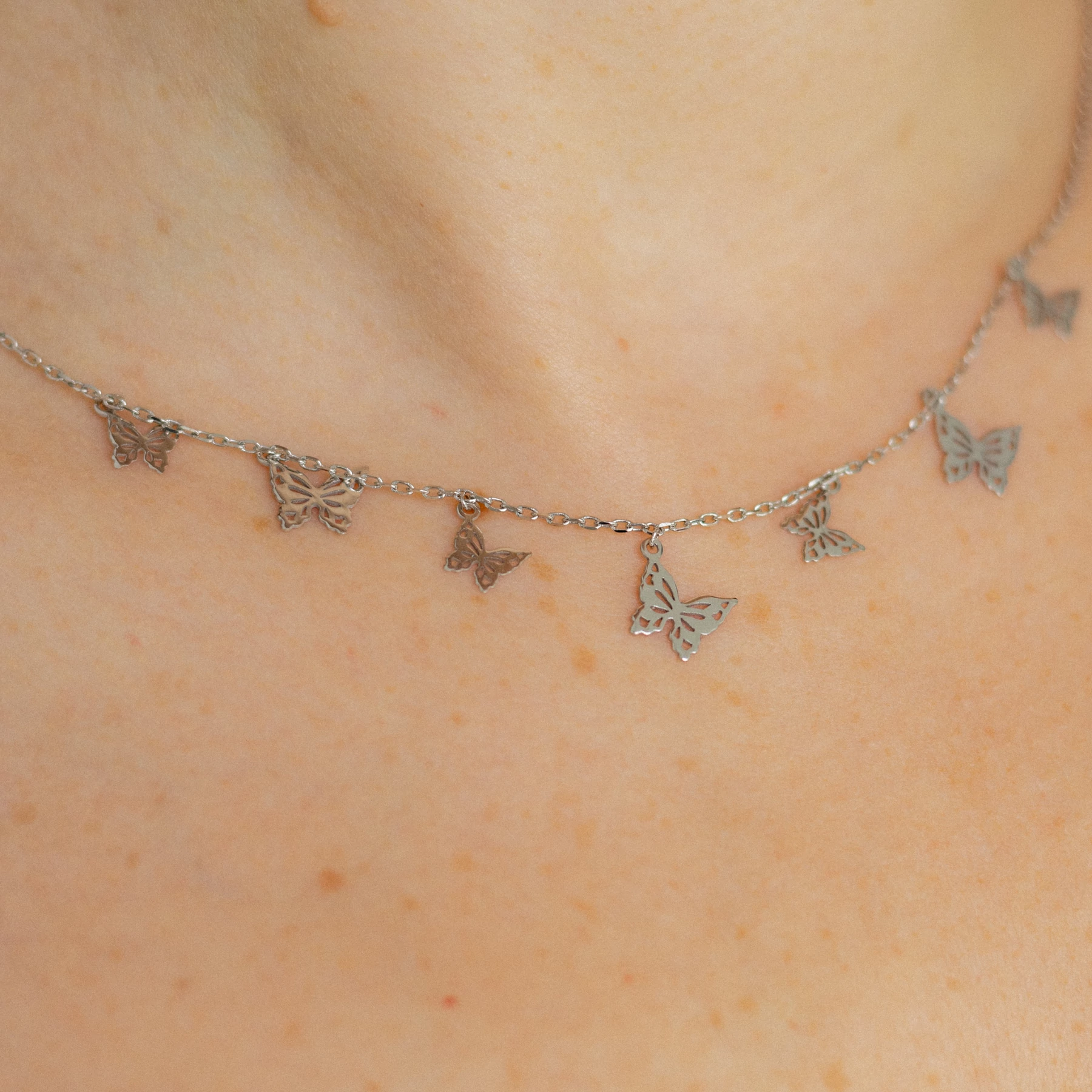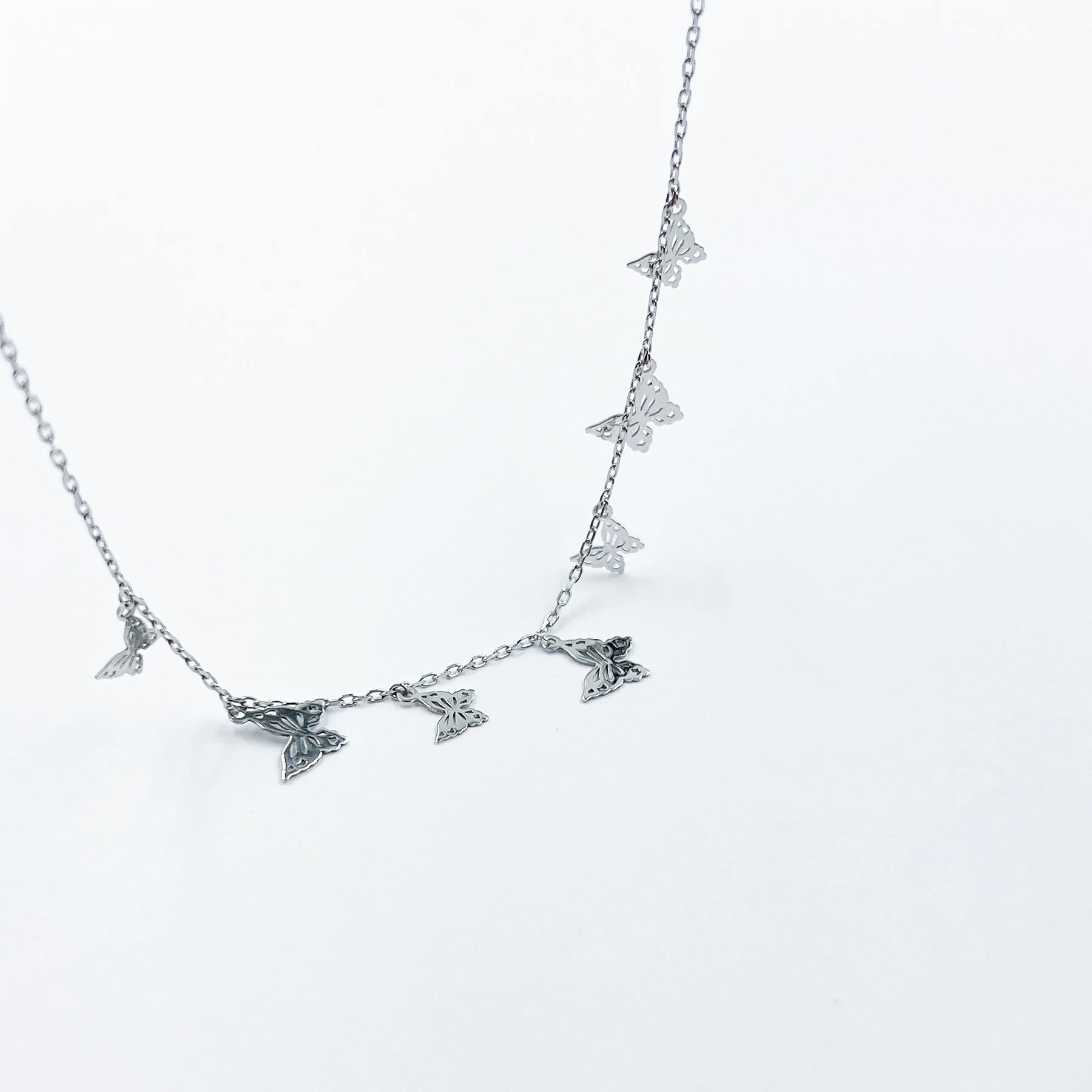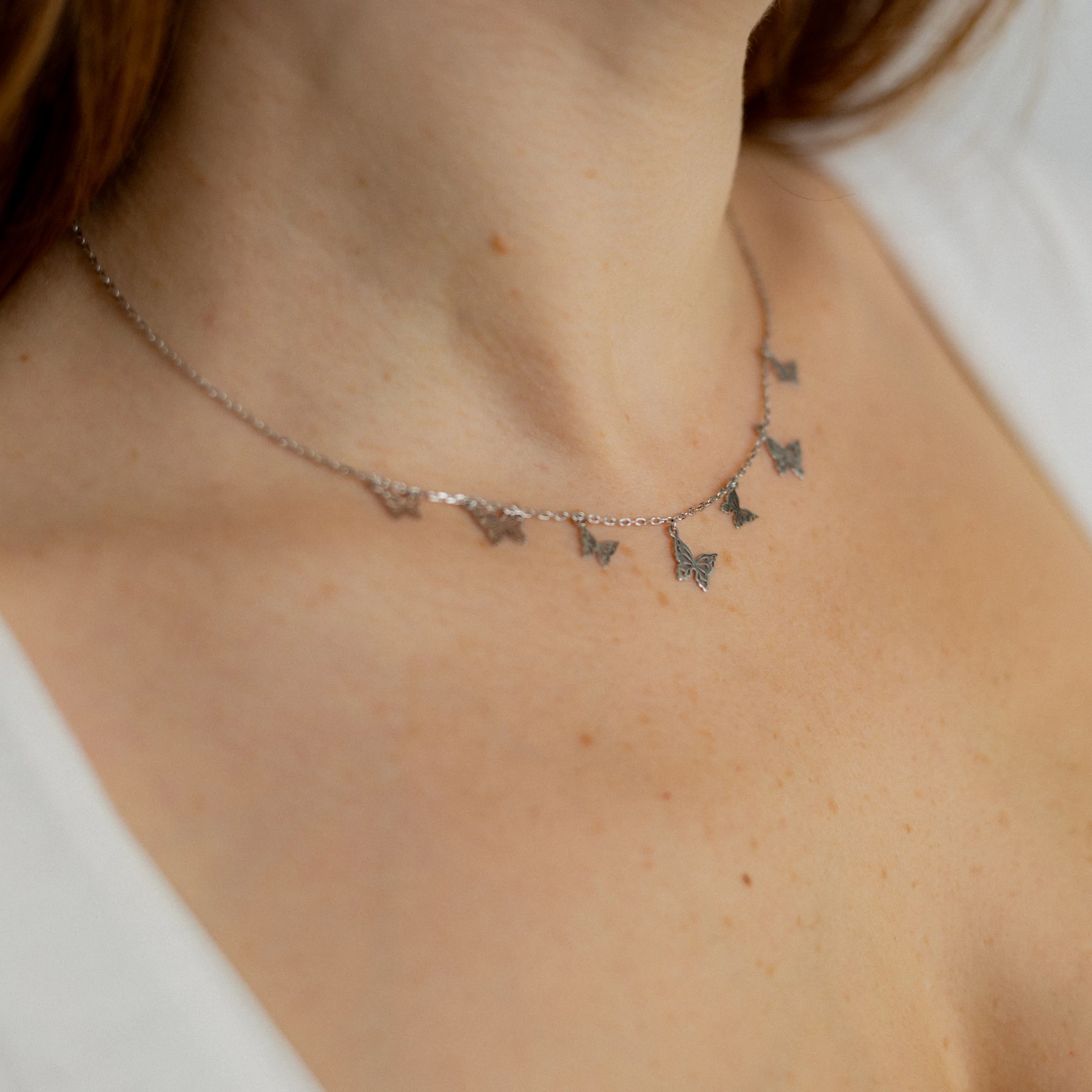 Ancilla ezüst ékszerünk egy gyönyörű, ródium bevonattal ellátott anker nyaklánc, melyen imádnivaló pillangó medálok lógnak. Ancilla nyakláncunk állítható hosszúságú.