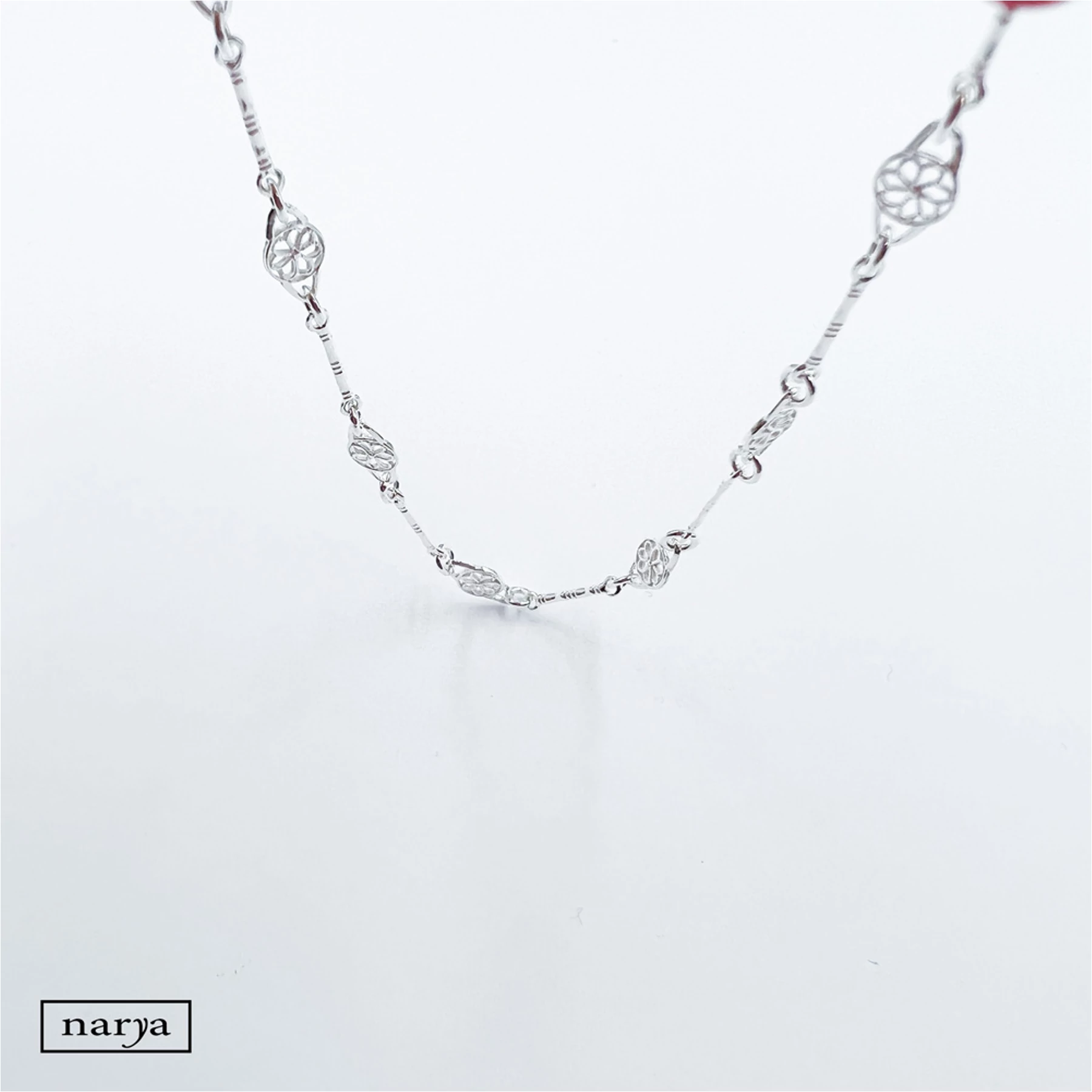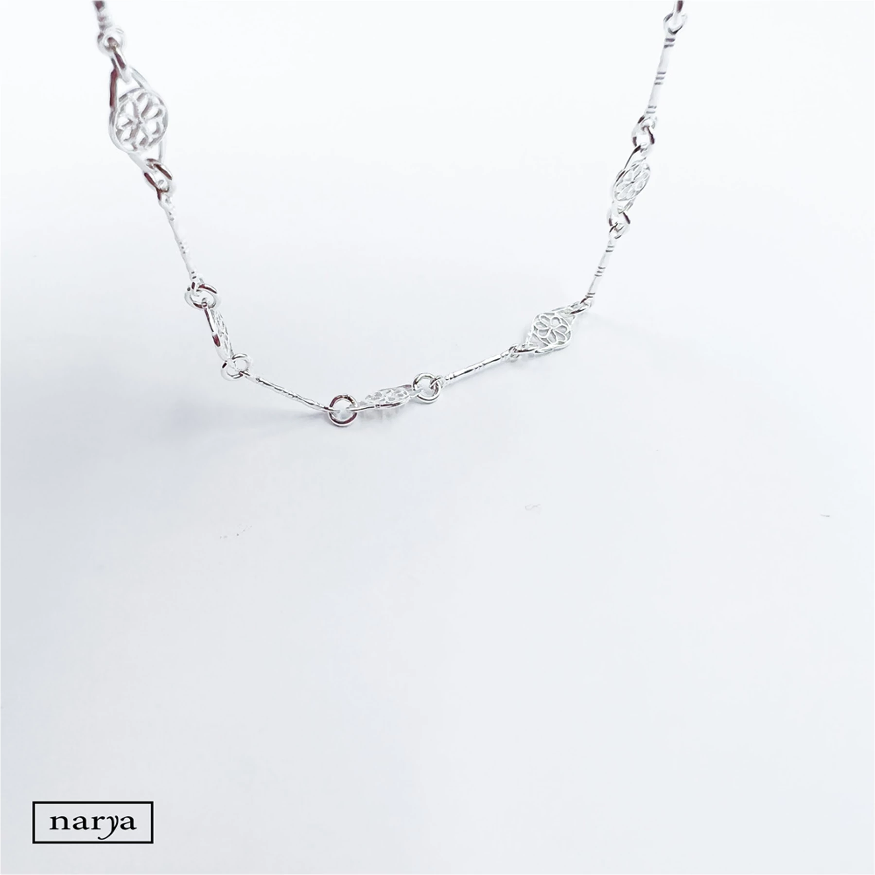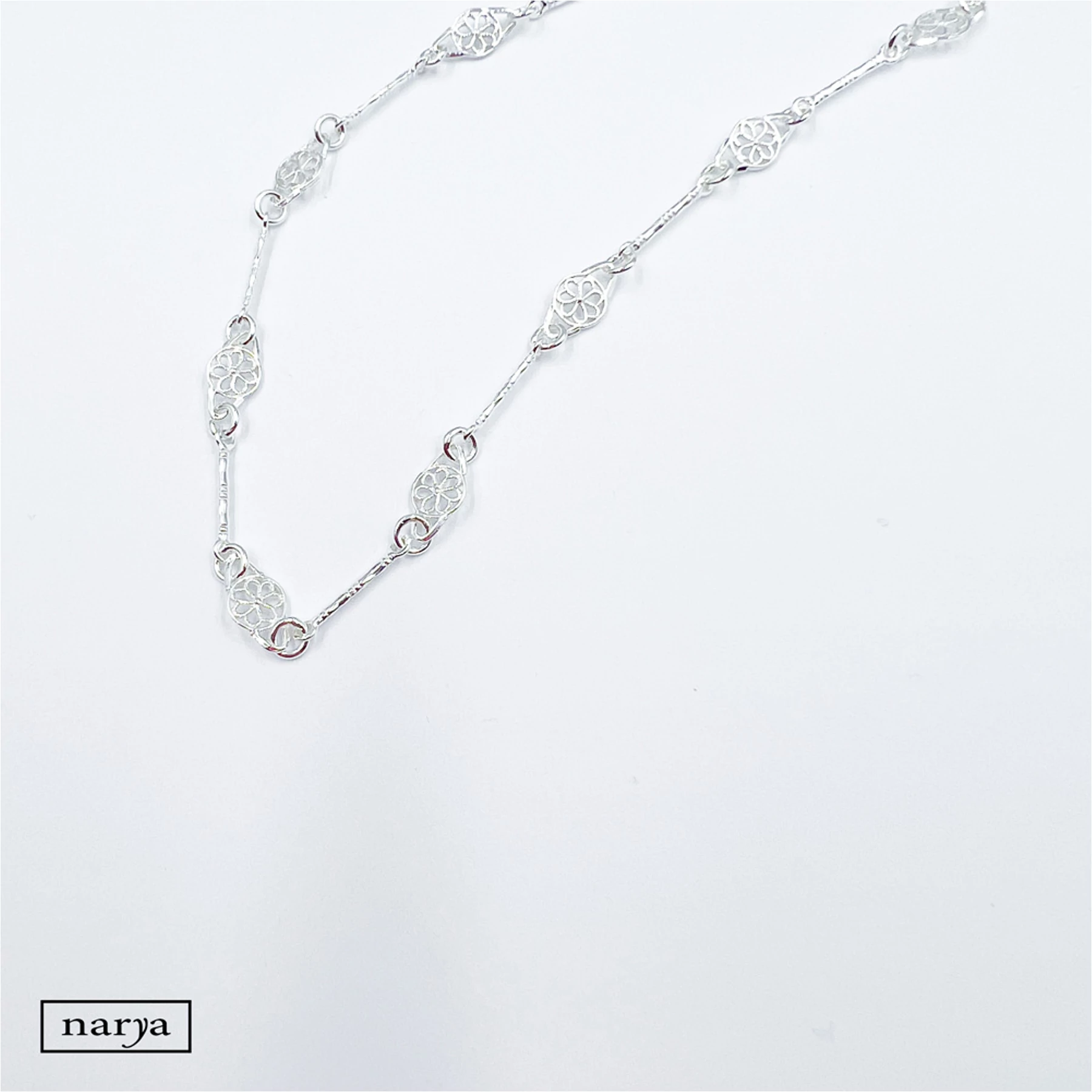 Anda ékszerünk egy gyönyörű, ezüst virágokat ábrázoló bokalánc. Tökéletes viselet egy csodálatos nyári napon.