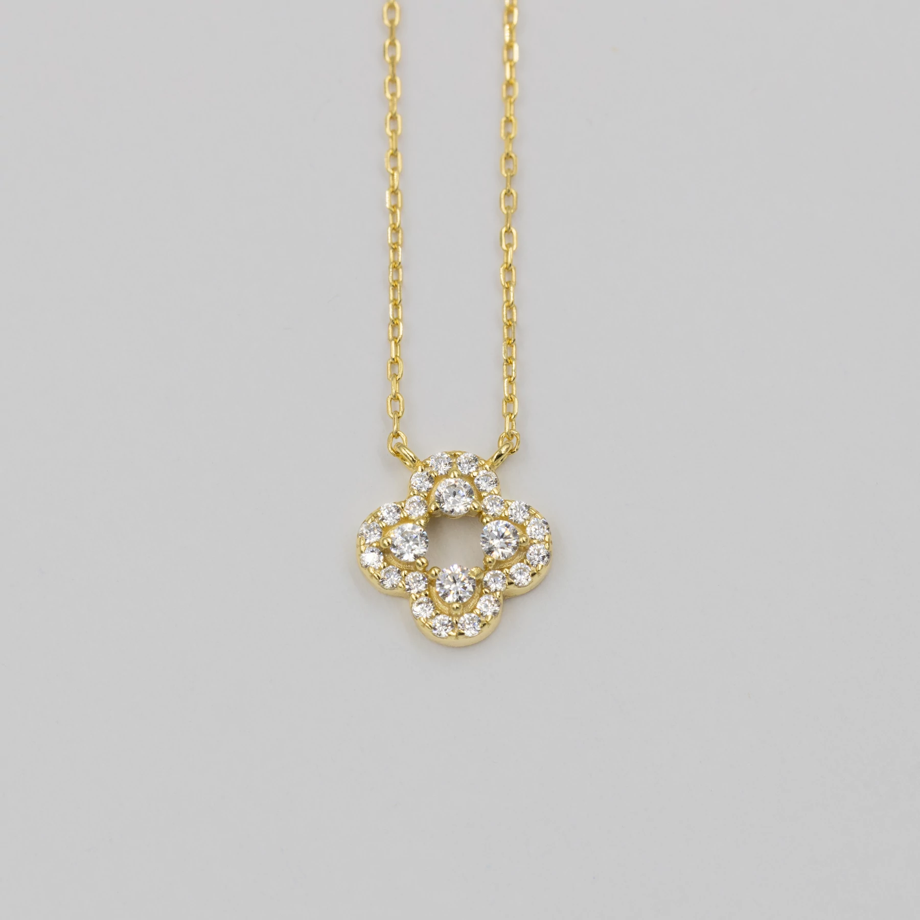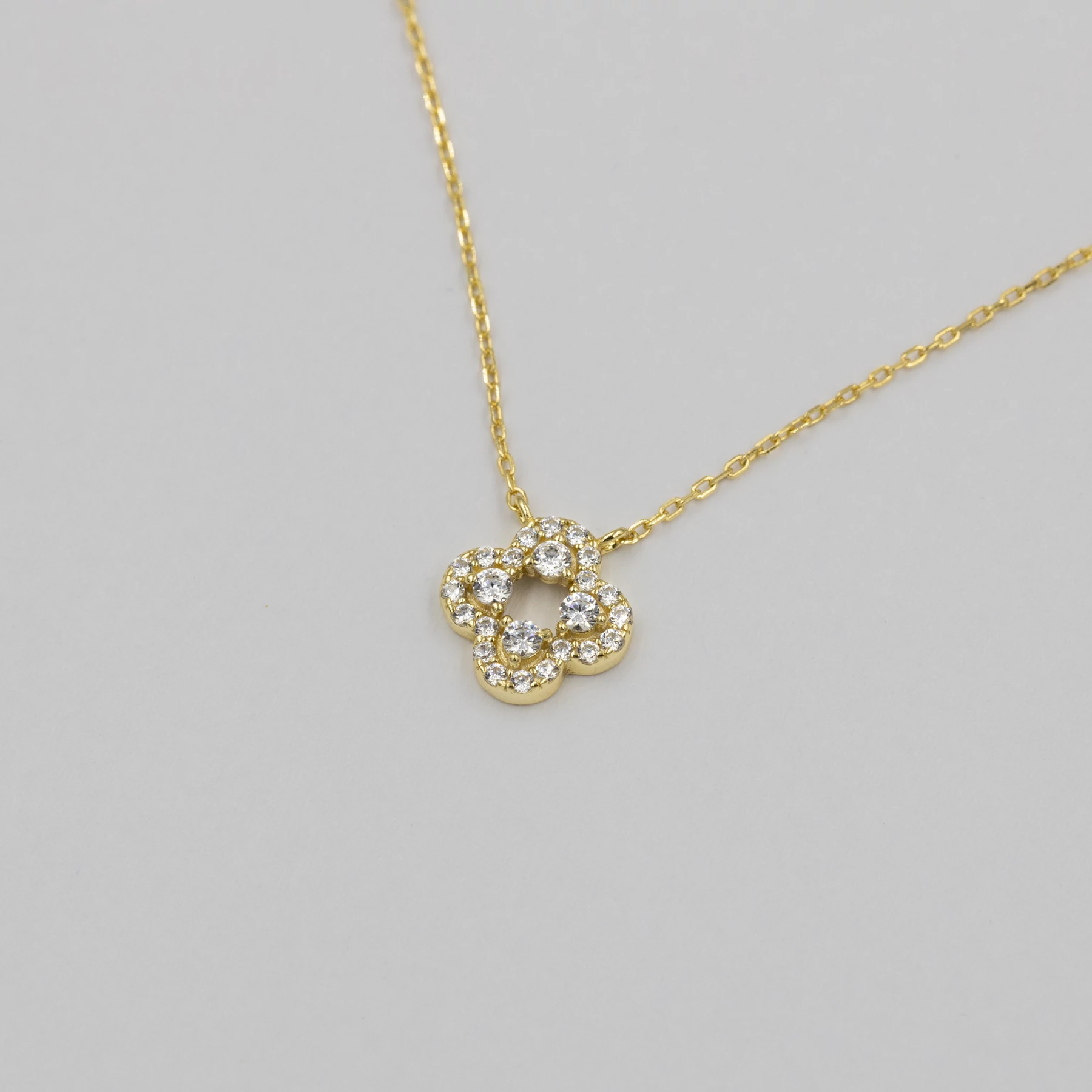Aziza ezüst nyakláncunk egy aranyozott ékszer, melyet egy rajta lógó, aranyozott, négylevelű lóhere formájú, gyönyörű cirkónia kövekkel díszített medál teszi igazán különlegessé. Ezüst, aranyozott Aziza nyakláncunk nagyon letisztult, mégis tökéletesen megállja a helyét akár különleges alkalmakkor is.