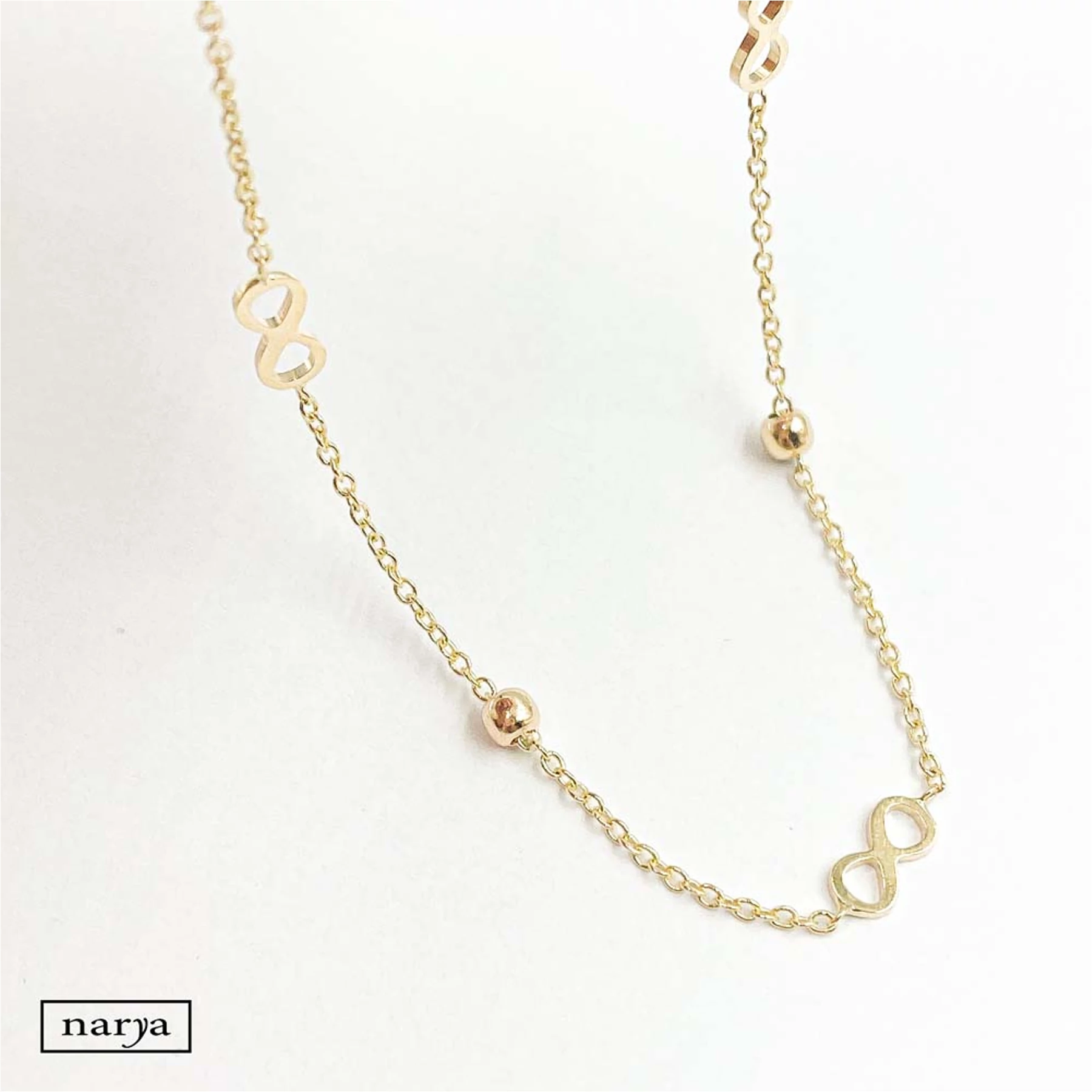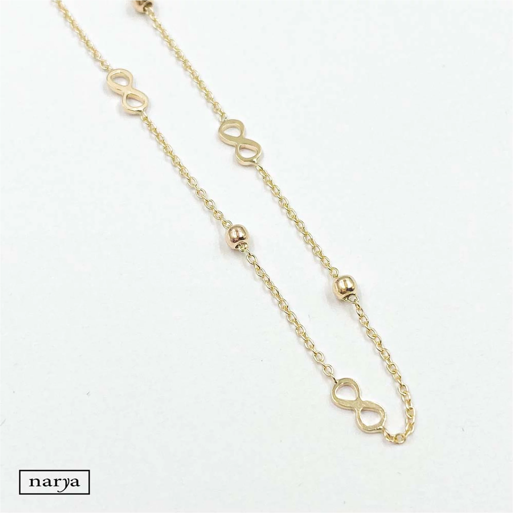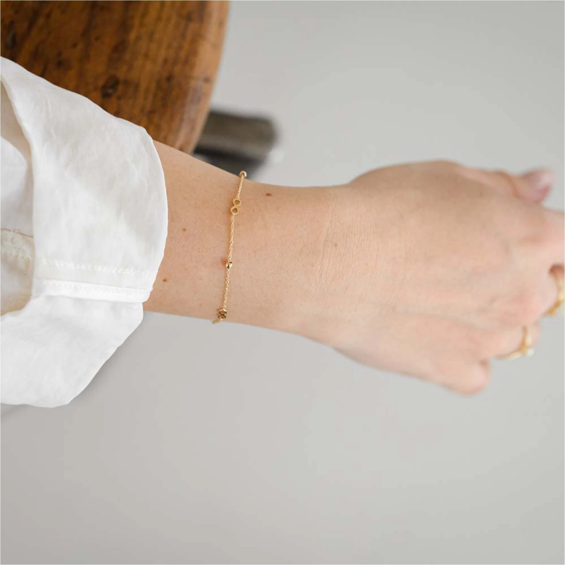 Borka karkötőnk egy 14 karátos arany vékony karkötő, bogyókkal és végtelen jelekkel díszítve. Tökéletes párosítás Borkati nyakláncunkkal.