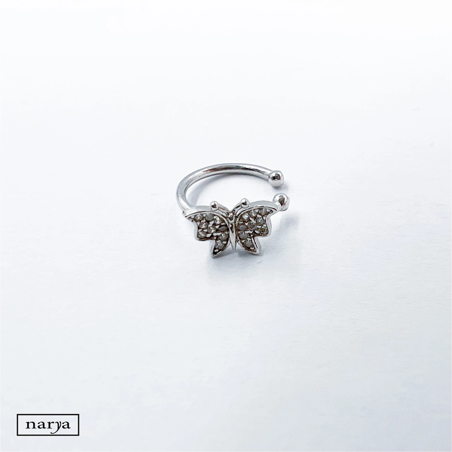 Ezüst, ródiumozott, cirkónia kövekkel kirakott pillangó formával díszített fülgyűrű.