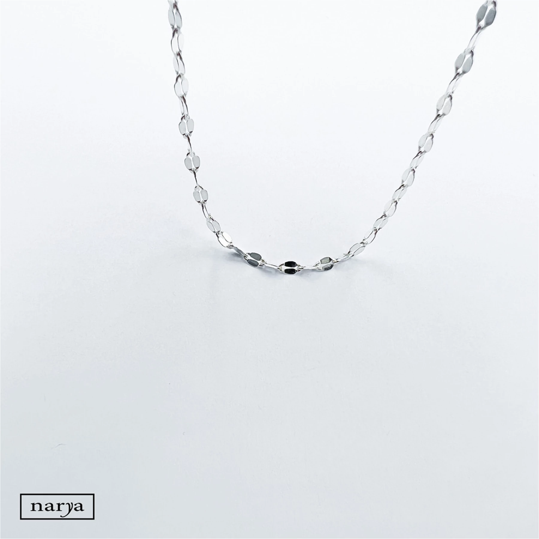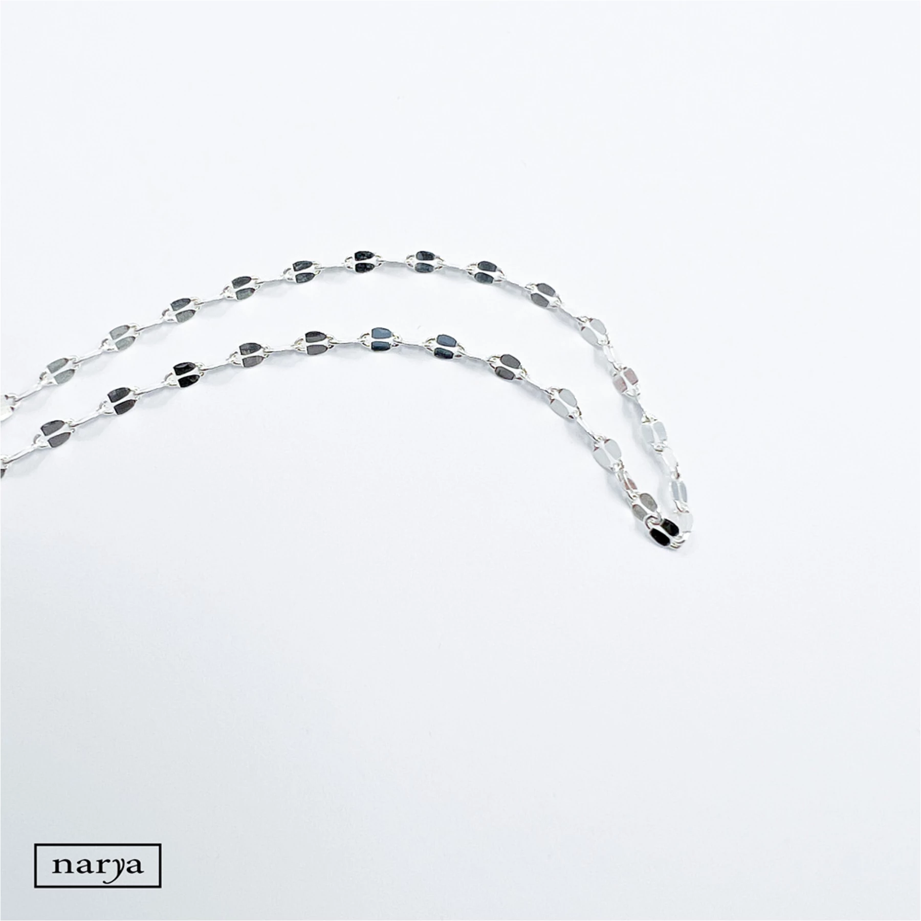 Dorka ékszerünk egy nagyon szépen fénylő, laposított láncszemekből álló ezüst bokalánc, melynek hosszúsága 24 cm. Gyönyörű fényét a láncszemes kialakításának köszönheti, egymagában ajánlott ékszer kiegészítőként viselni, hiszen így is egy mutatós darab.