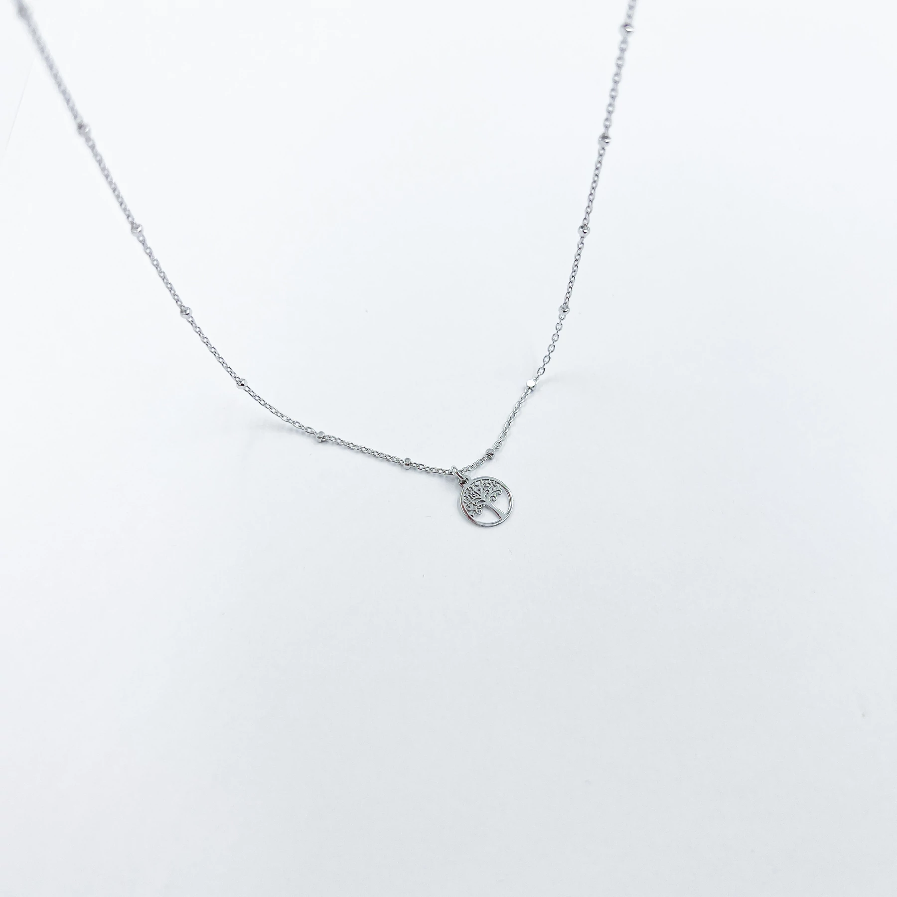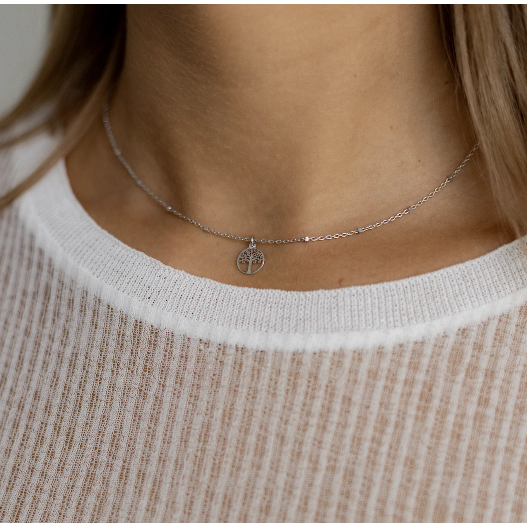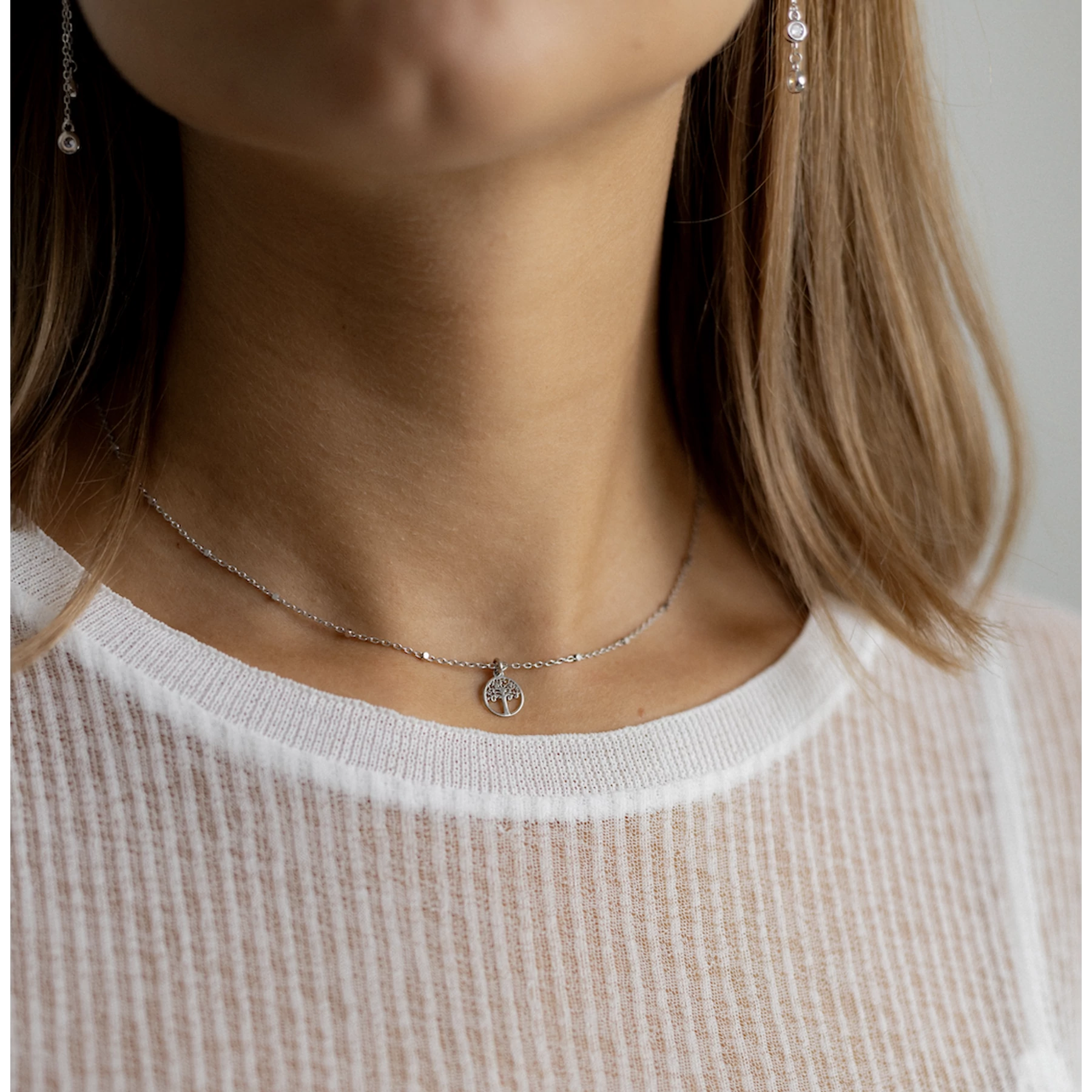 Emma ezüst ékszerünk egy ródiumozott anker nyaklánc, melyet aprócska kocka medálok és egy életfa medál díszít. Tökéletes választás a mindennapokra.