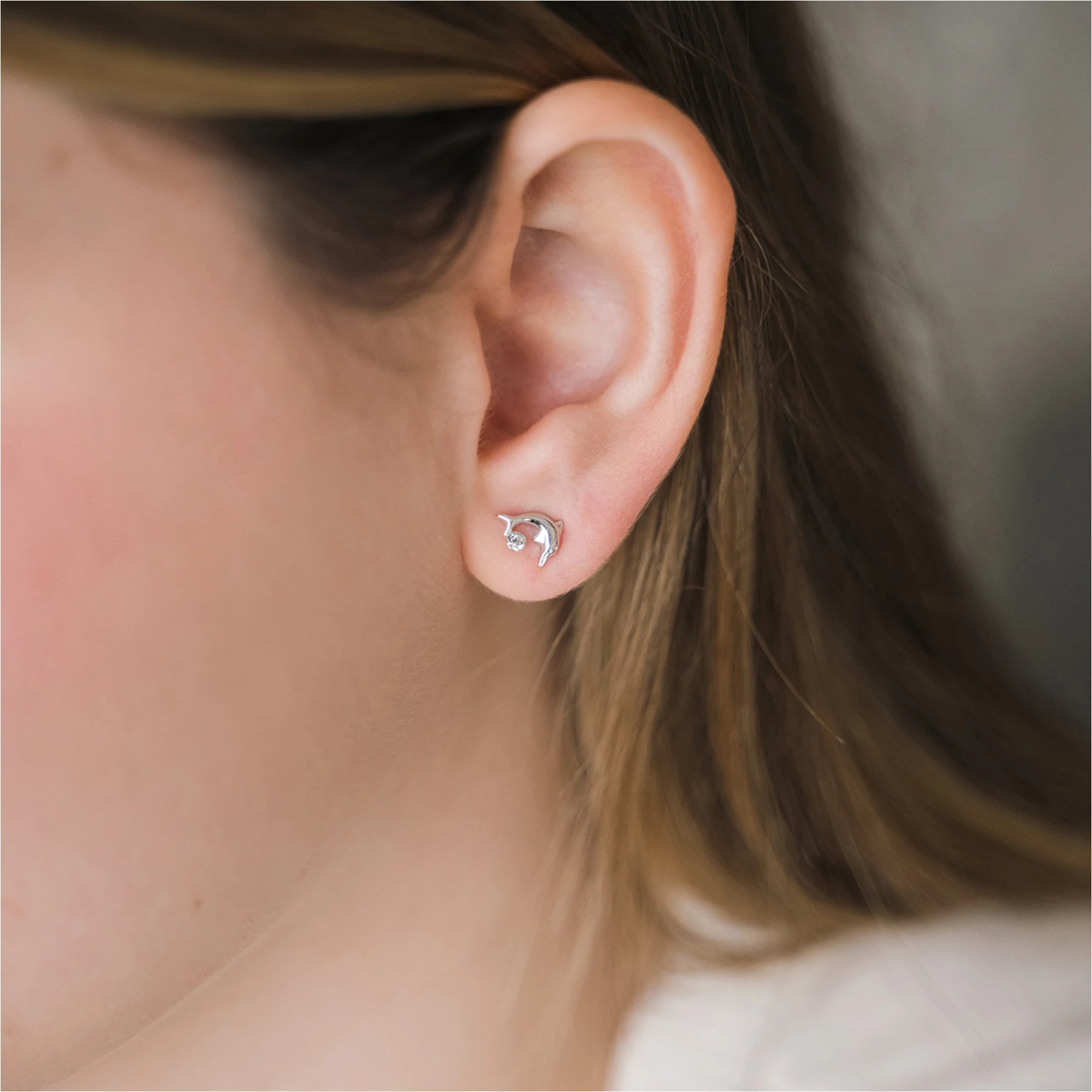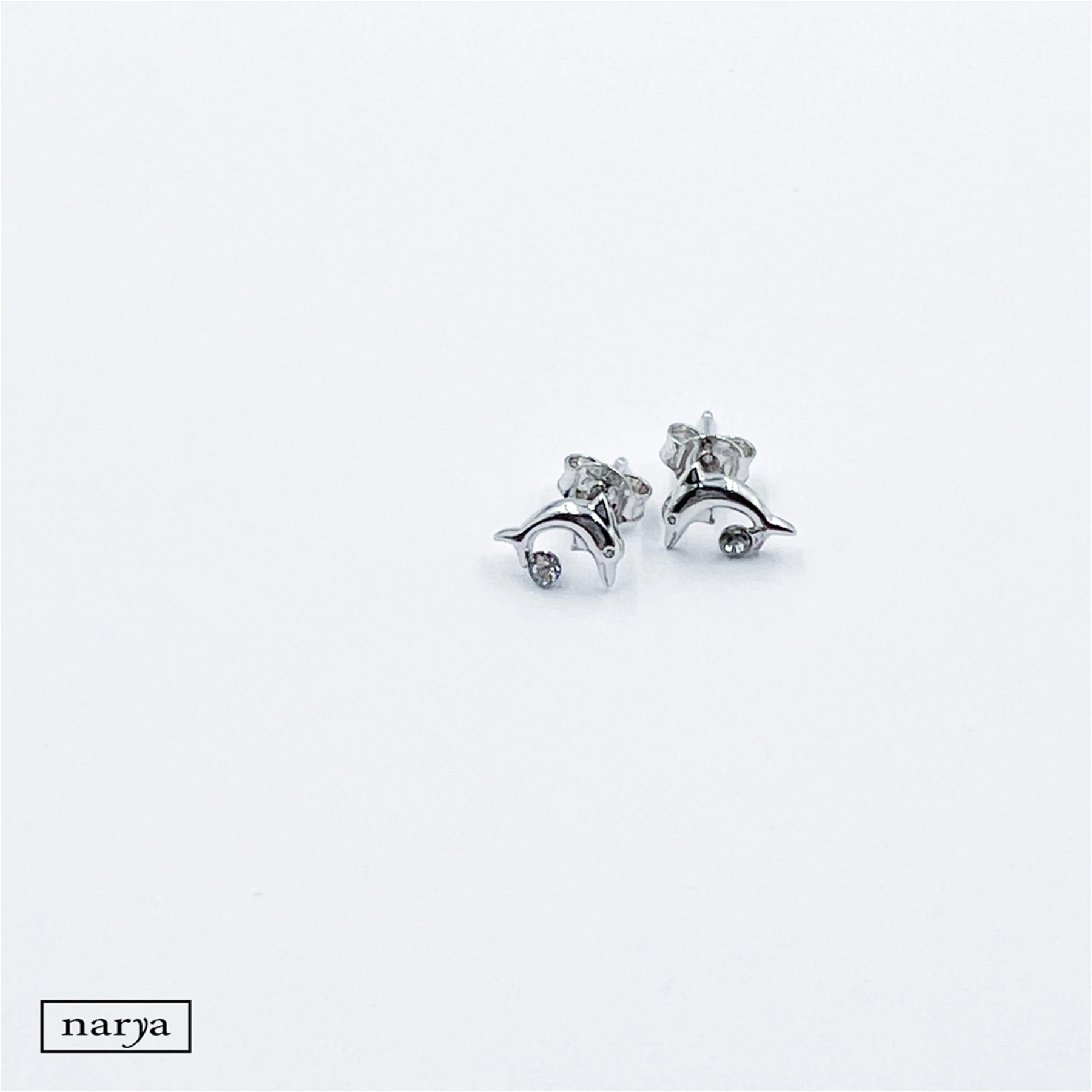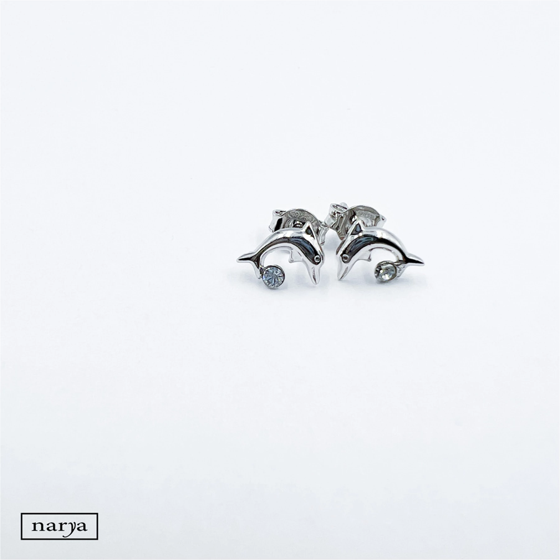 Ezüst, ródiumozott, swarovski kritállyal díszített delfin formájú fülbevaló, stekkeres rögzítéssel.