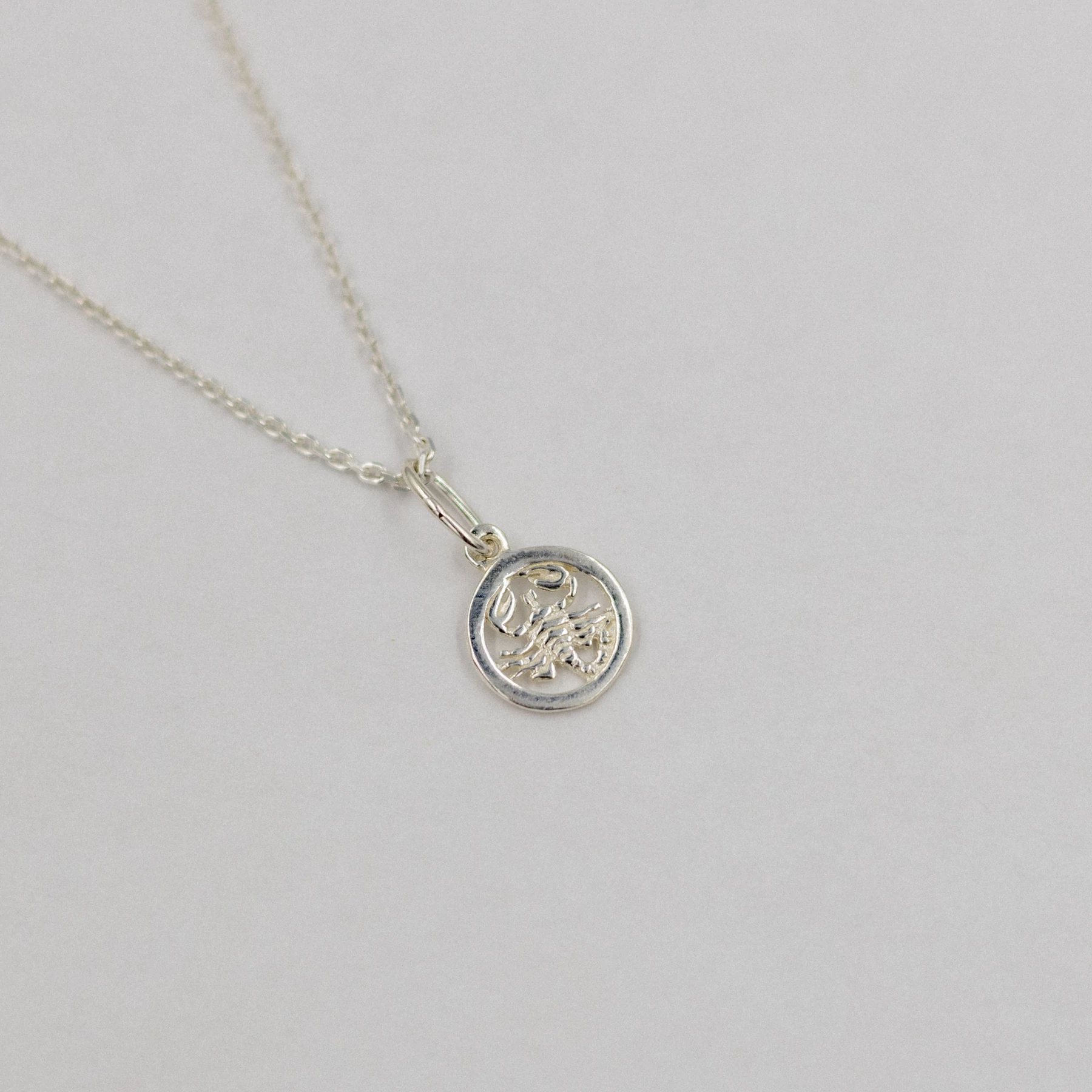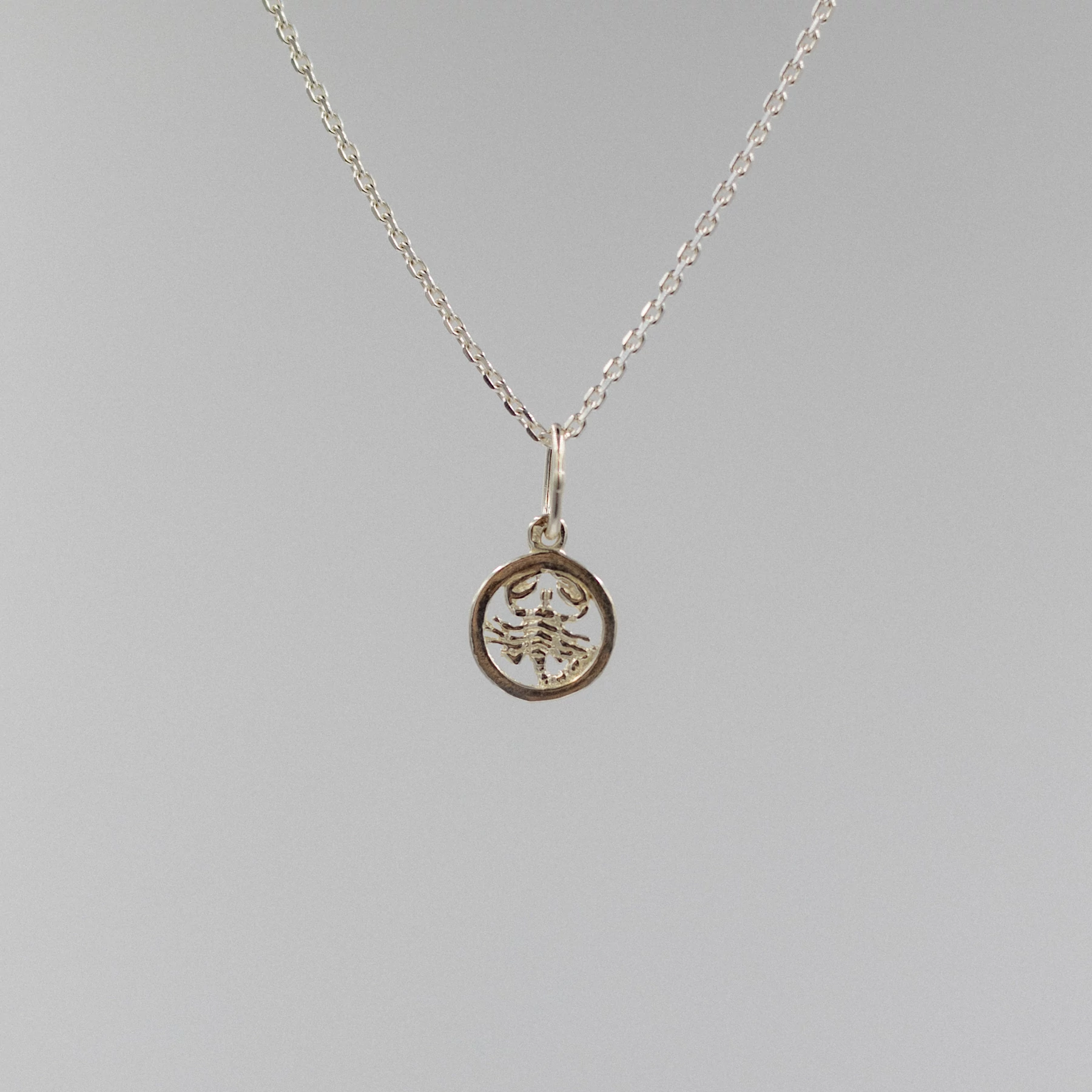 Ezüst Skorpió horoszkóp medálunk egy gyönyörű, letisztult darab. Ezüst kör medál, mely közepén egy skorpió díszeleg. Tökéletes választás a mindennapokra, mely ékszer mellé tartozik egy ezüst anker nyaklánc, választható méretben.