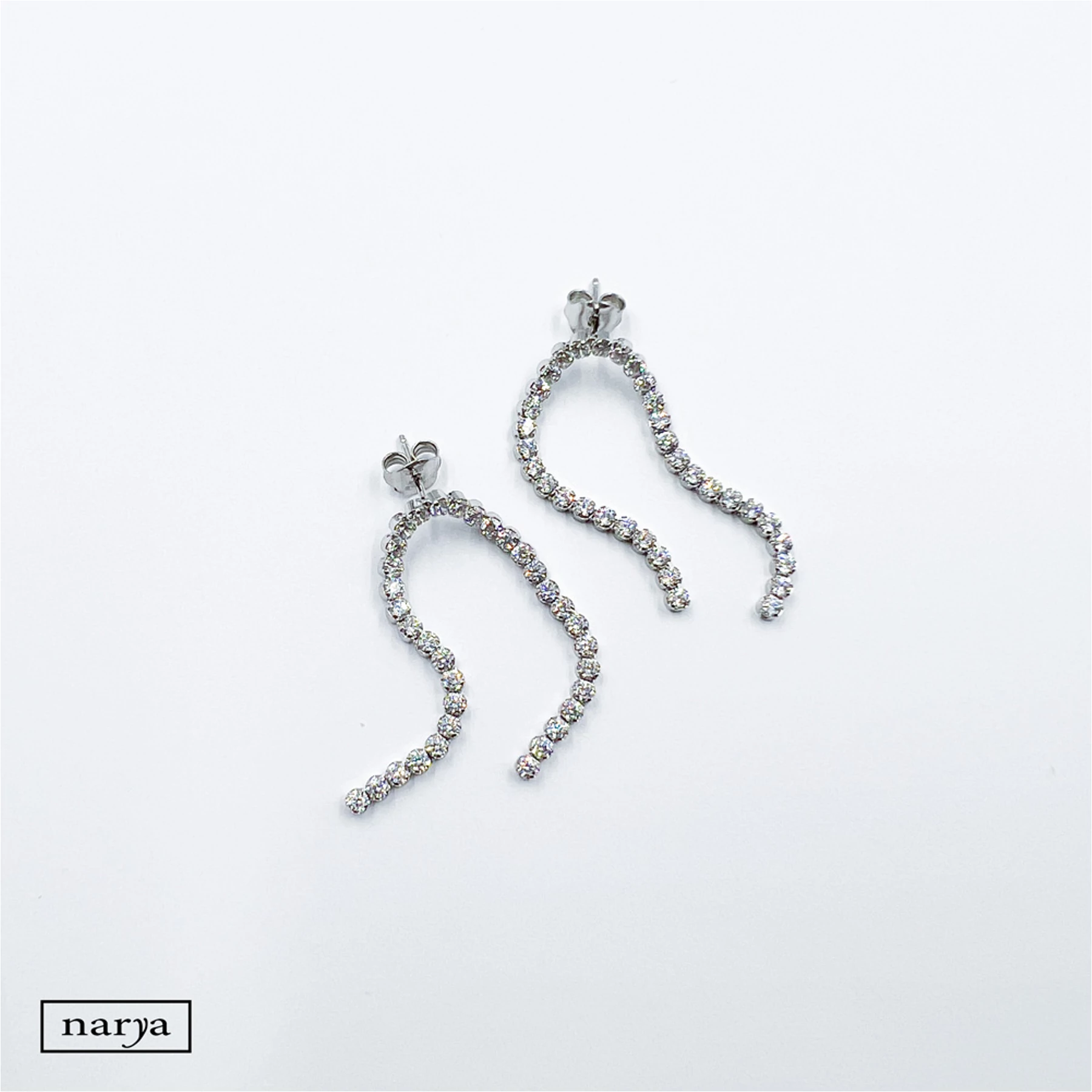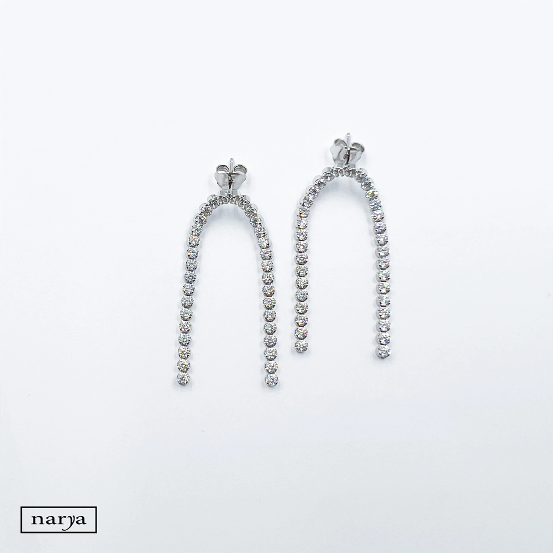 Ezüst, swarovski kristályokkal díszített, fordított U alakban lógó fülbevaló, melynek rögzítése stekkeres.