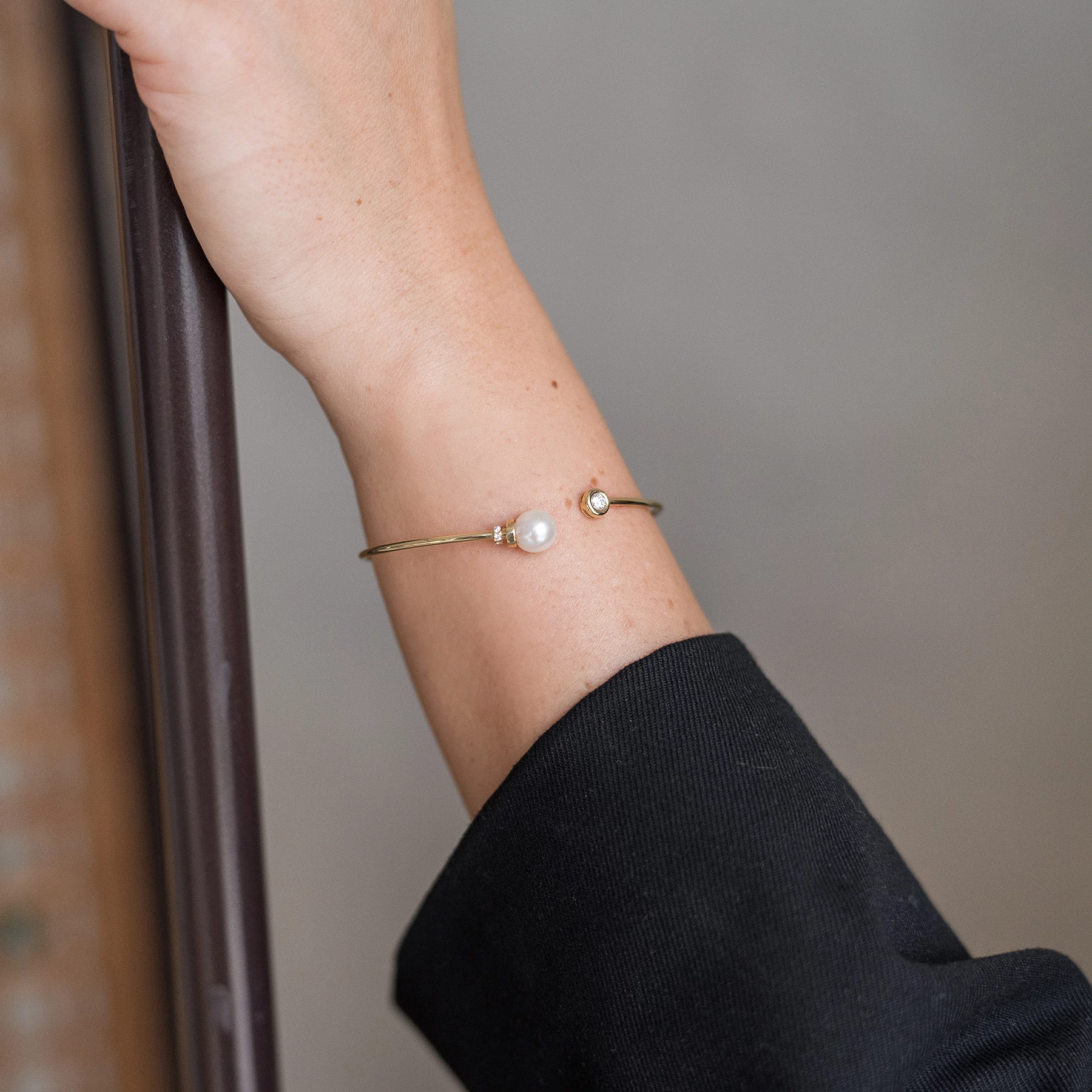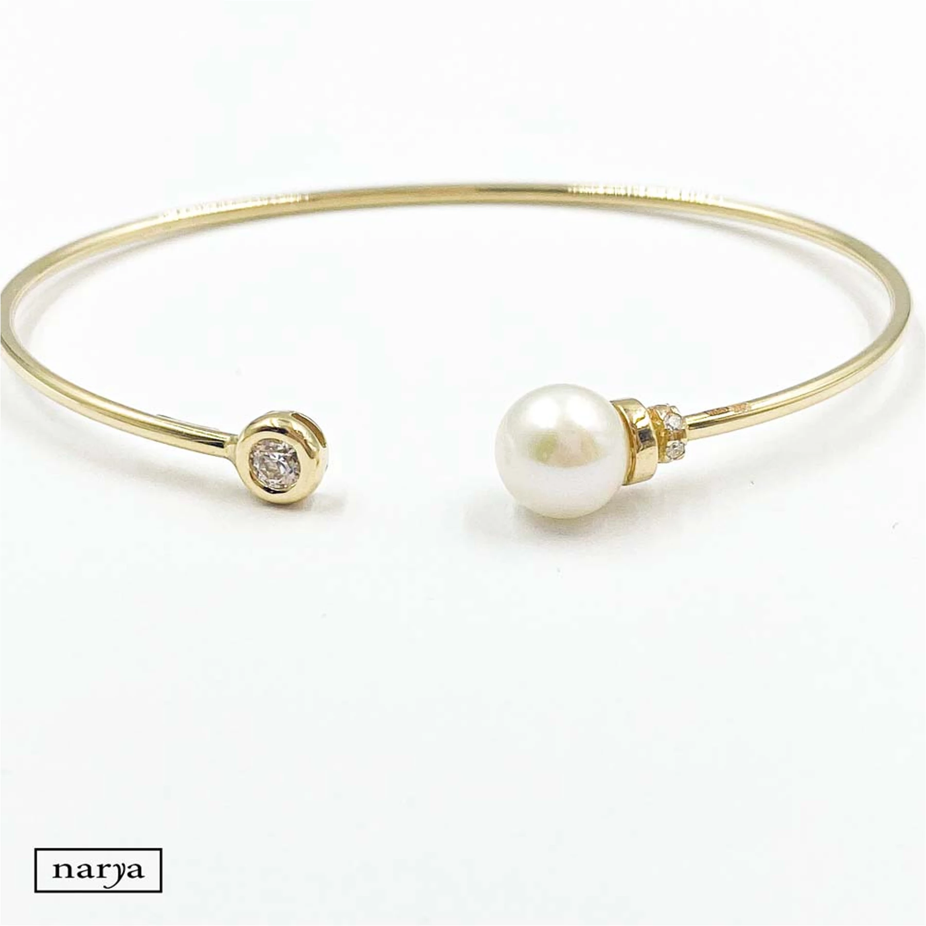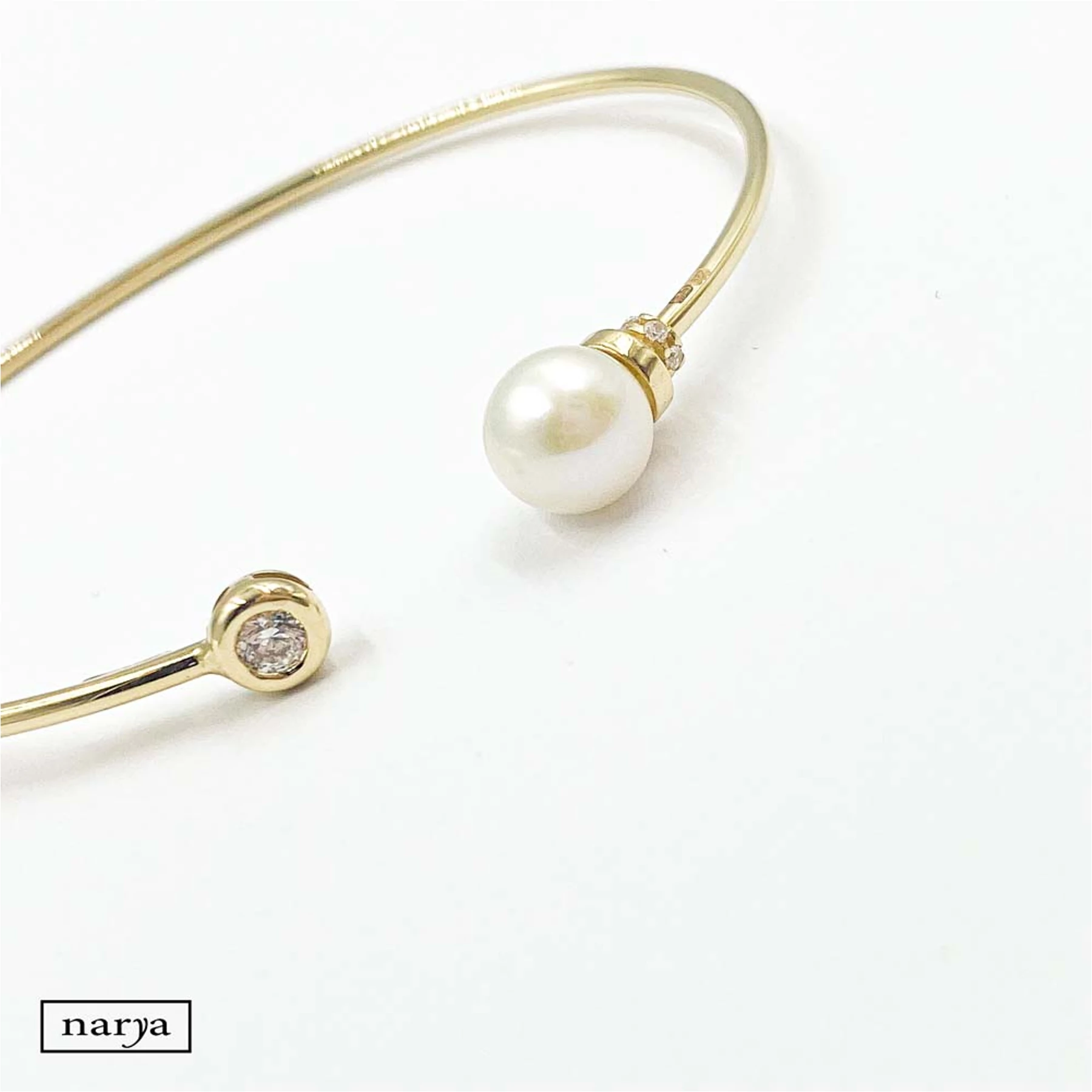 Gyöngyécske karkötőnk egy édesvízi tenyésztett gyönggyel, valamint cirkónia kővel díszített, üreges, 14 karátos, arany karreif. A karkötő merevsége miatt nem fordul el viselés közben.