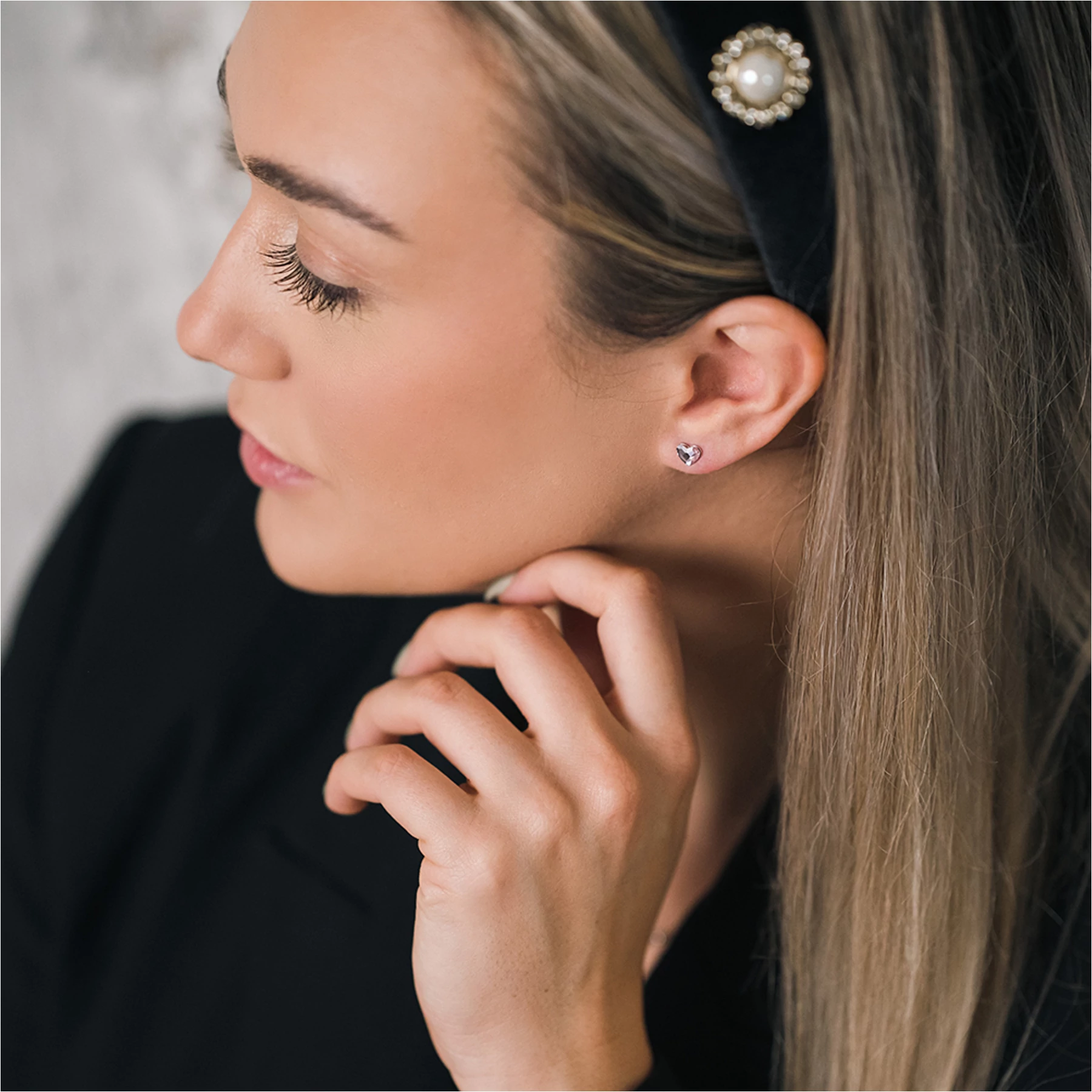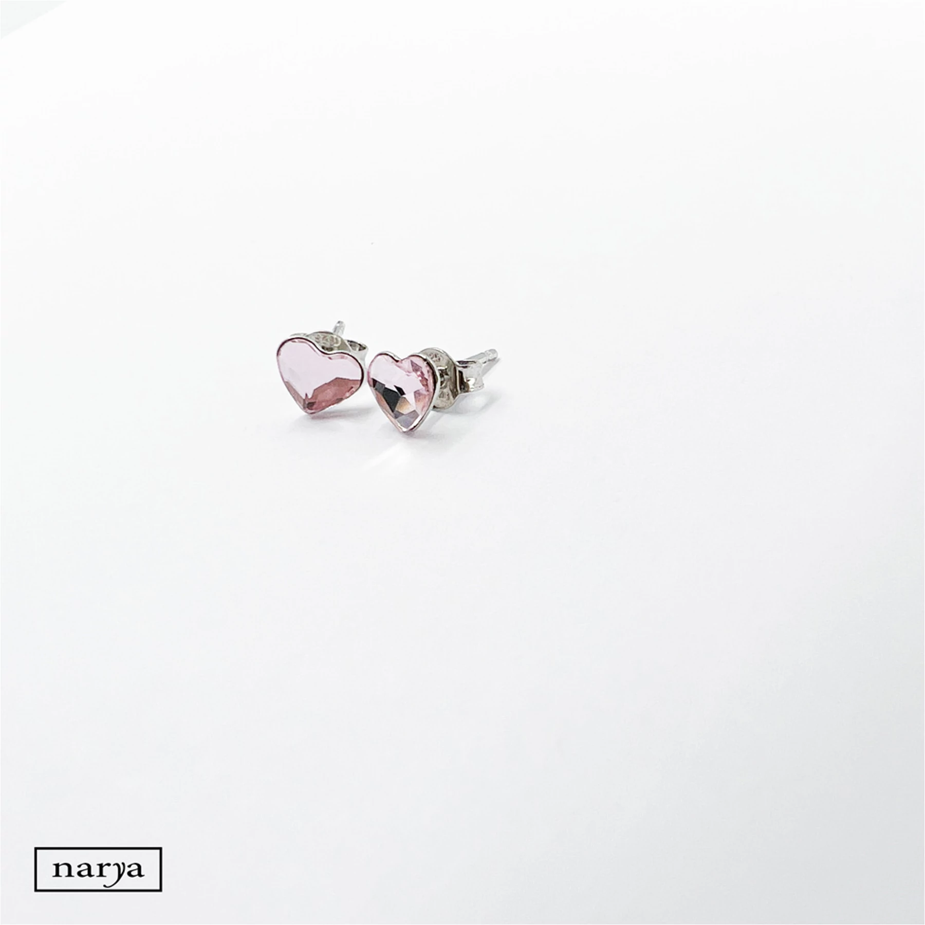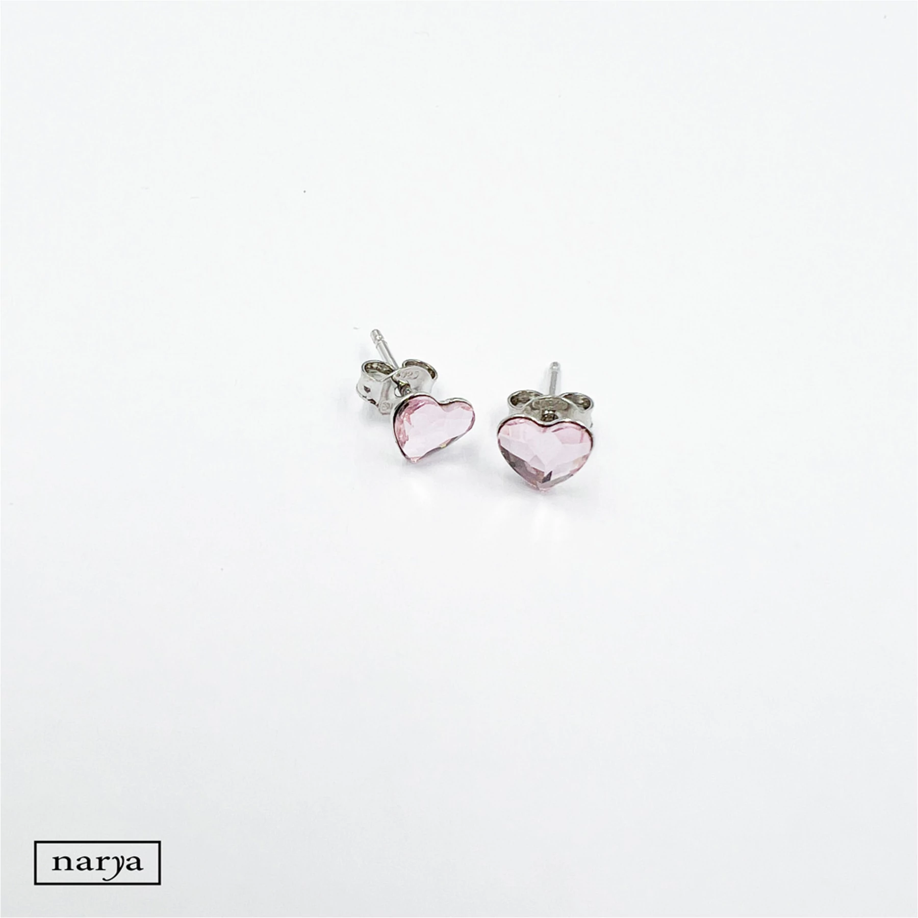 Ezüst, ródiumozott fülbevaló, melyet egy babarózsaszín szív alakú swarovski kristály díszít.
