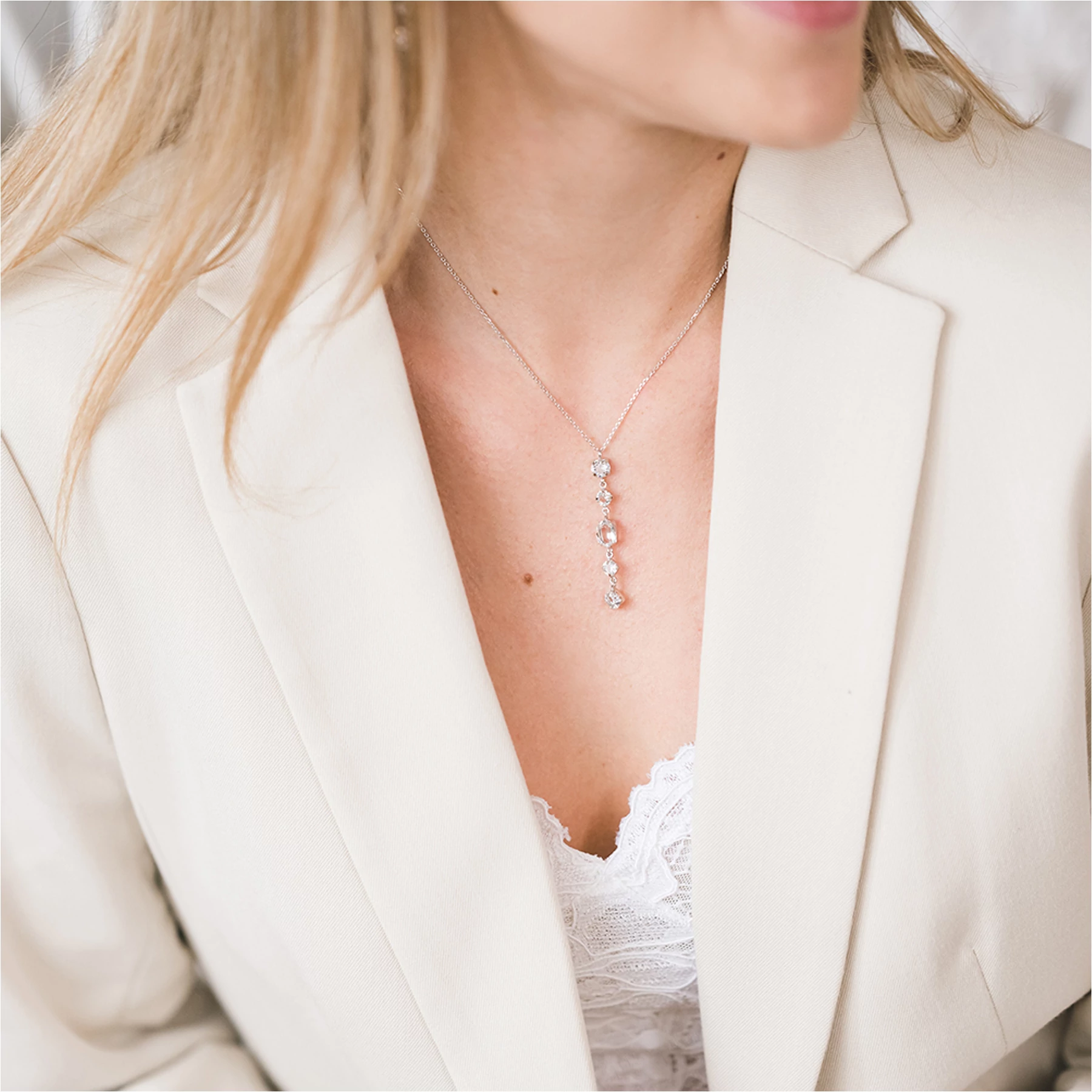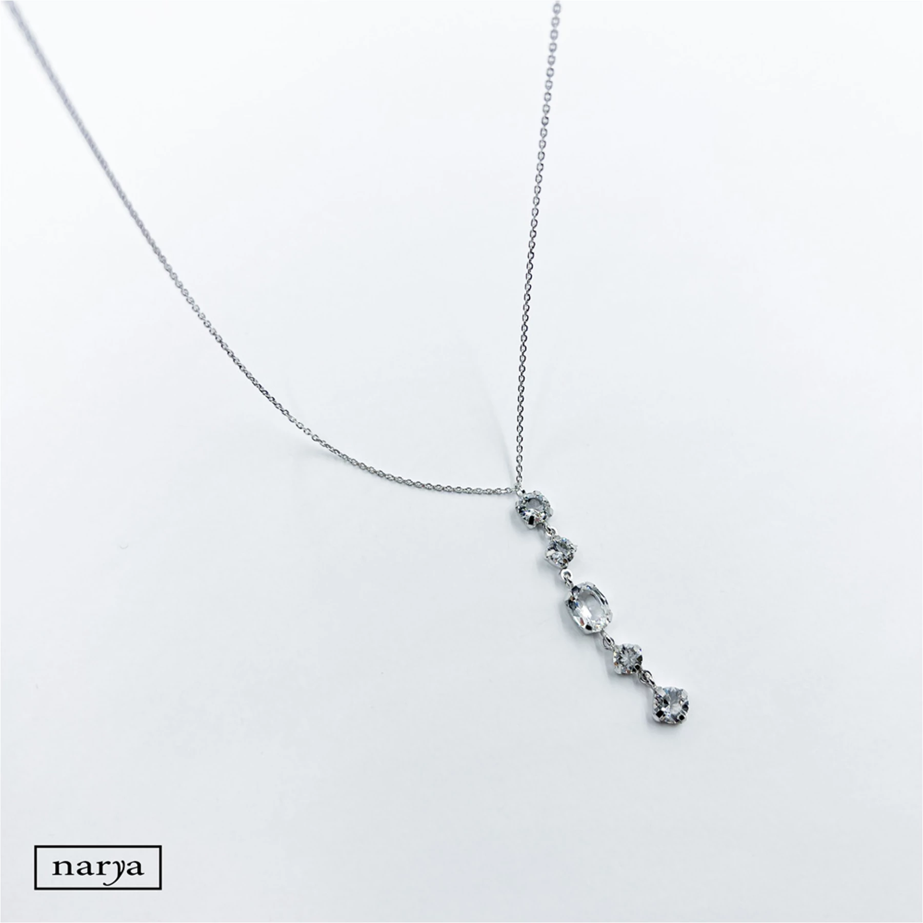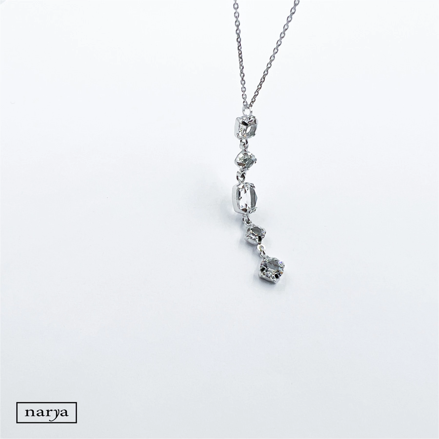 Julka ródiumozott nyakláncunk 925 ezrelékes finomságú ezüstékszer. A különböző alakú, fényes Swarovski kristályos medál a vékony anker nyaklánccal Y alakot formál.