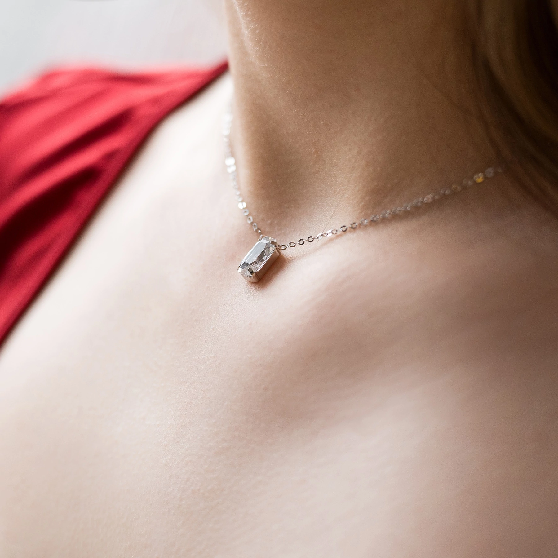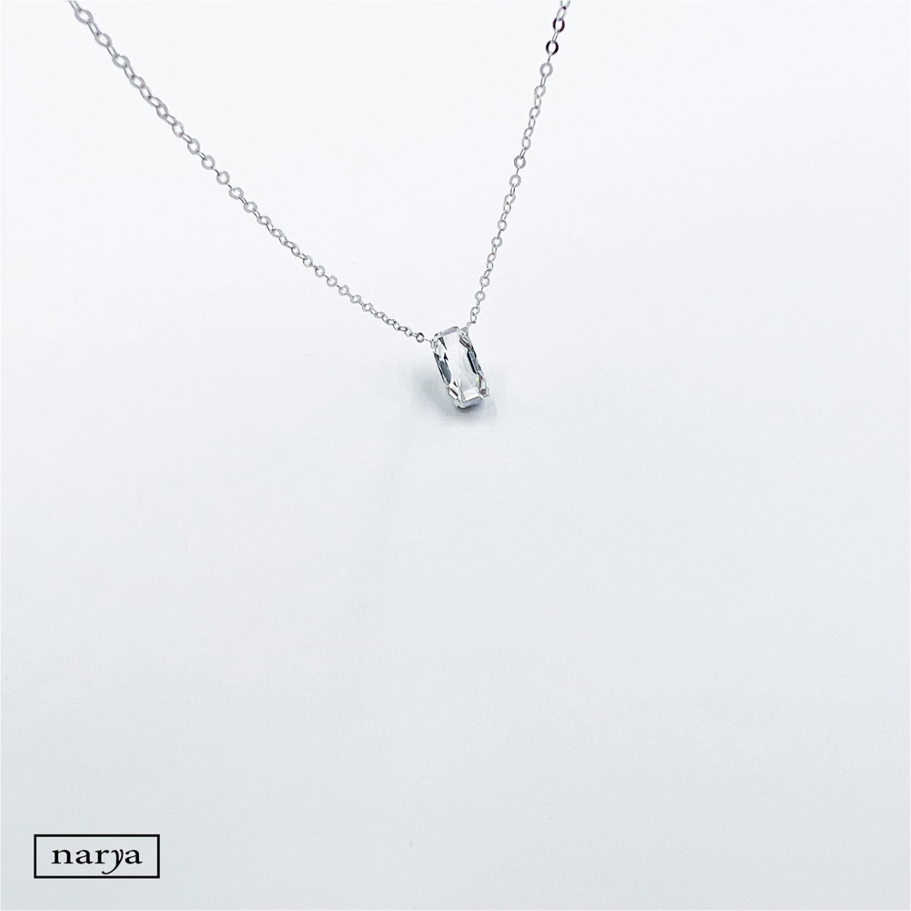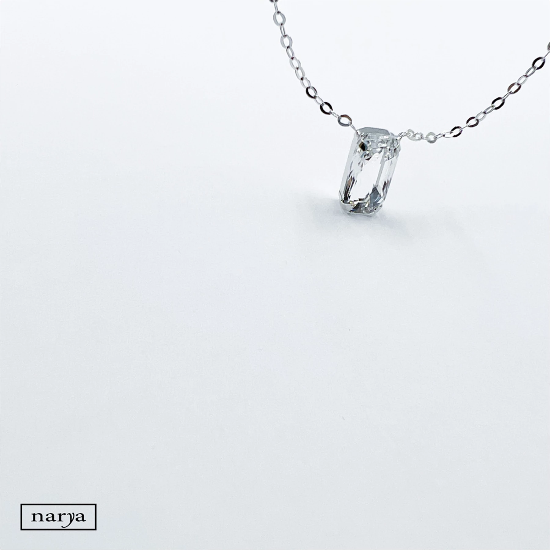Ezüst Leonóri ékszerünk egy igazán különleges, swarovski kristállyal díszített, ródiumozott nyaklánc. Az ezüst nyaklánc különlegessége, hogy a swarovski kristálynak téglalap alakja van, a nyaklánc láncszemei pedig pici karikákból állnak, melyek egymásba kapaszkodnak.