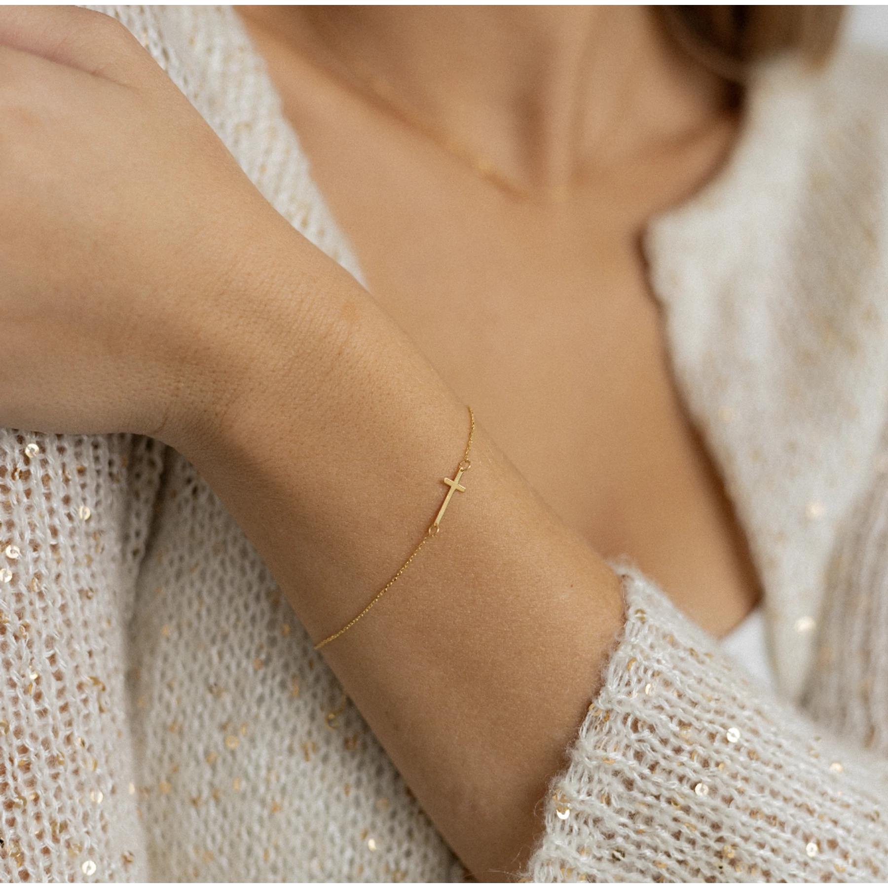 Lilienn 14 karátos sárga arany ékszerünk egy imádnivaló vékony anker láncos karlánc, melyen egy fektetett kereszt medál található. Tökéletesen fekszik a csuklón és szuper párosítás Mariann nyakláncunkkal.