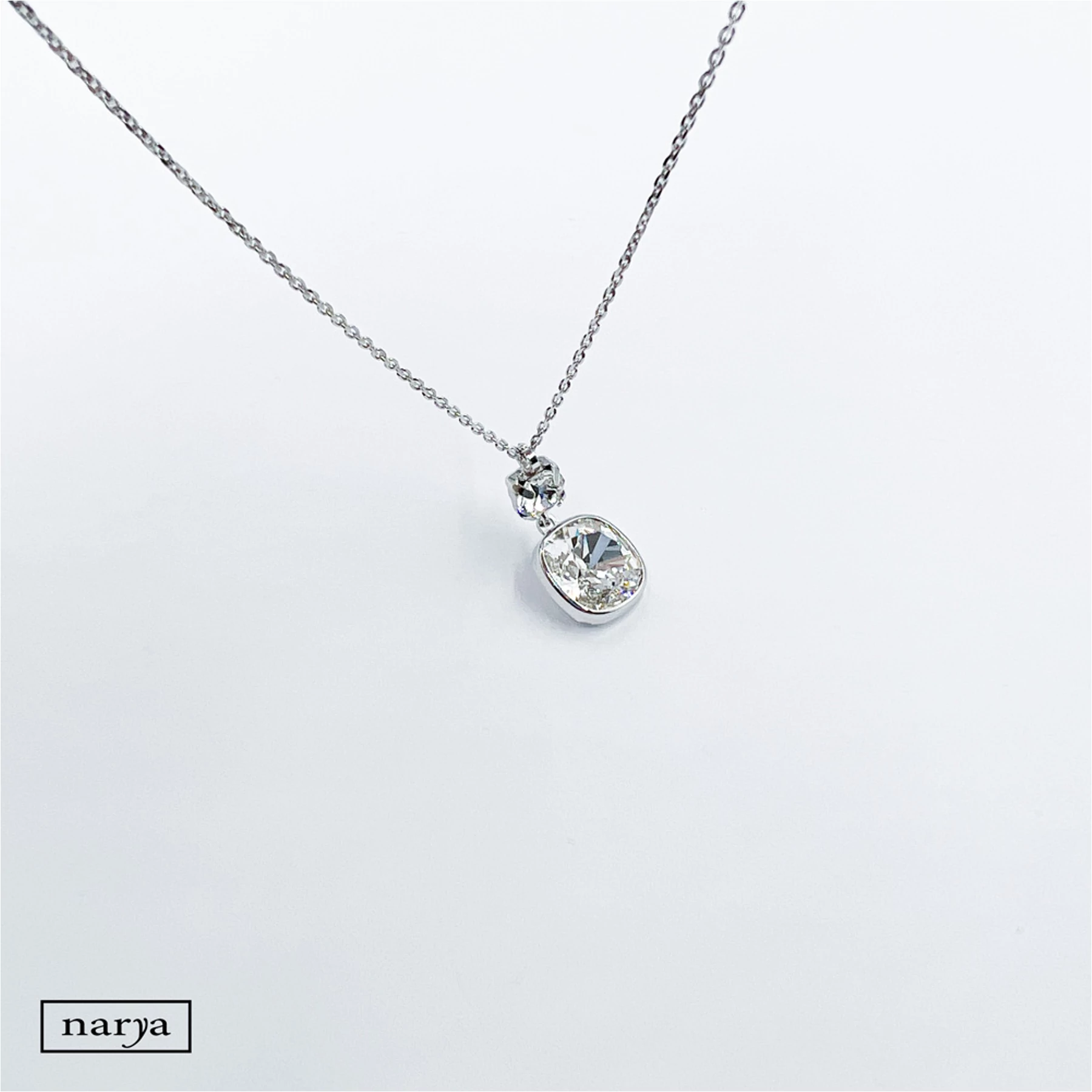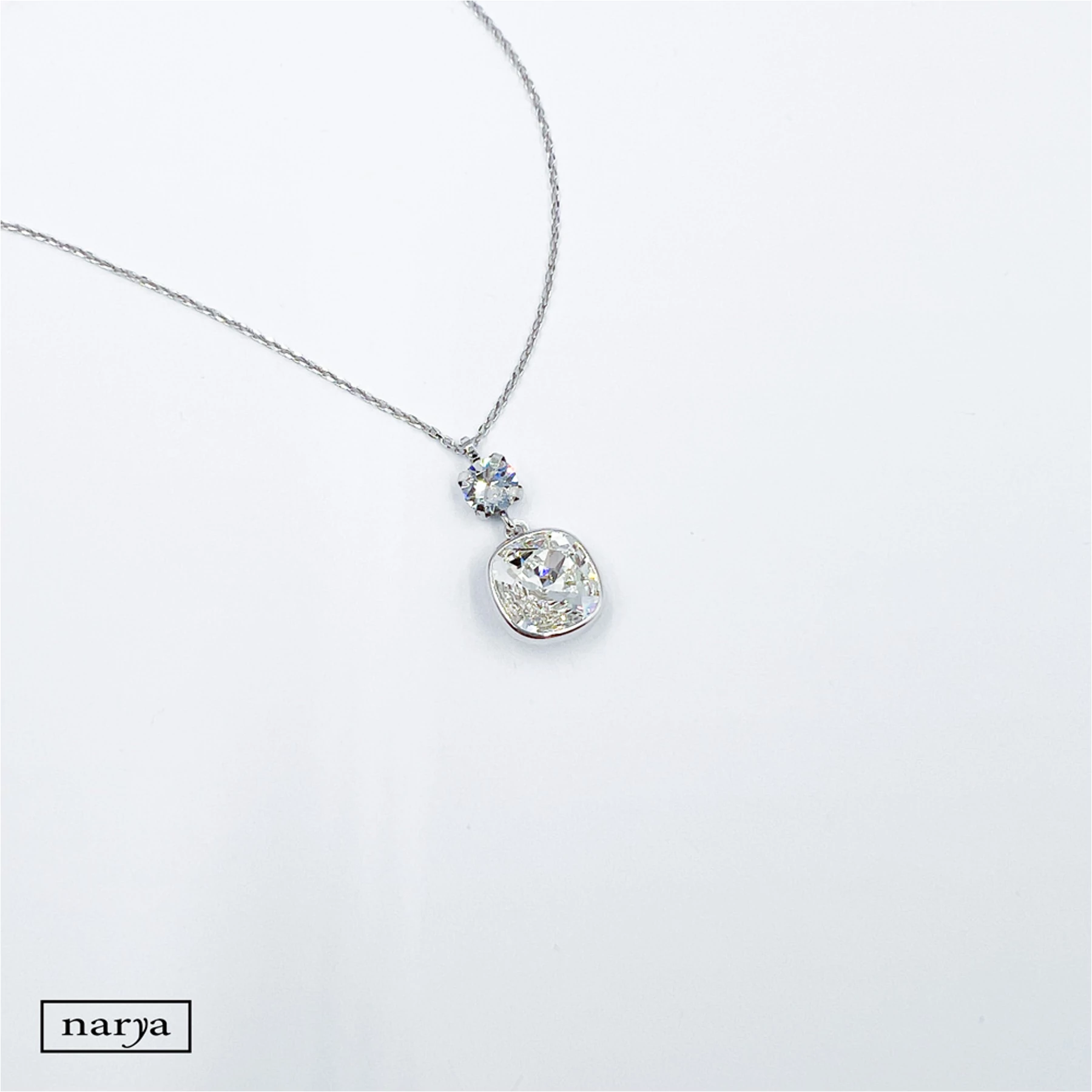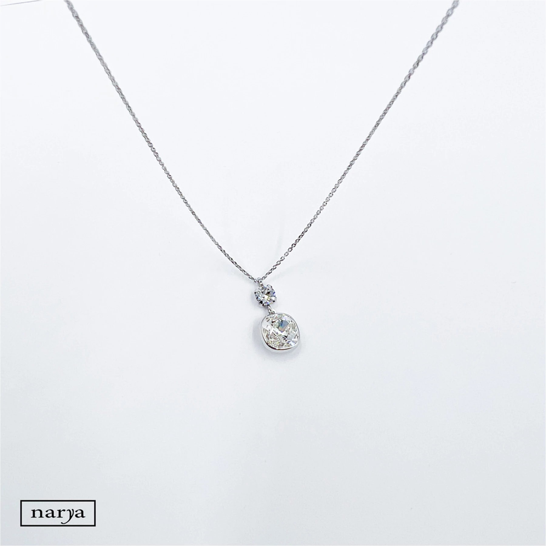 Lujzina ékszerünk egy igazán mutatós, ezüst, ródium bevonattal ellátott, egy nagy és egy kicsi swarovski kristállyal díszített nyaklánc. Tökéletes választás különlegesebb alkalmakra, akár egy Esküvőre is a menyasszony számára.