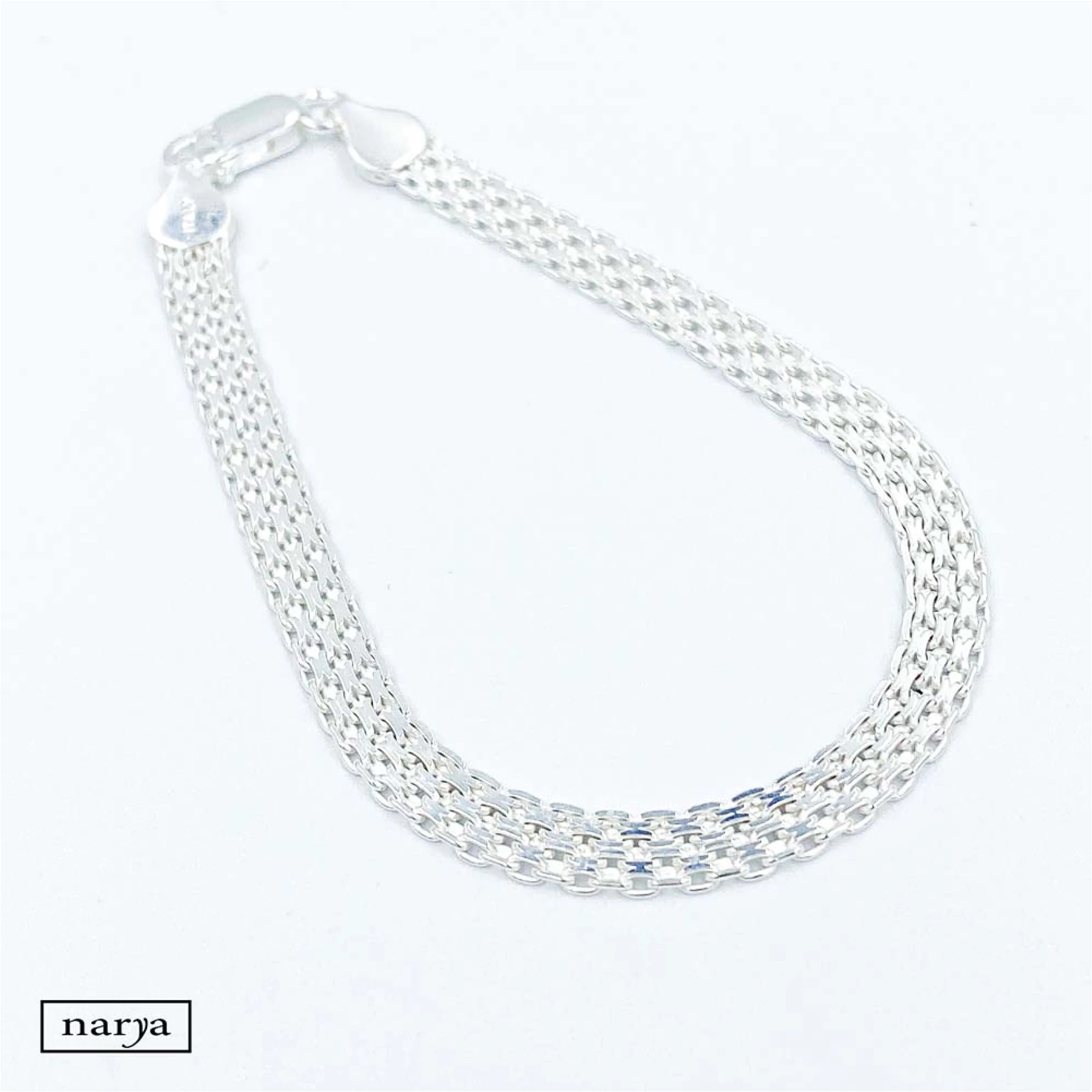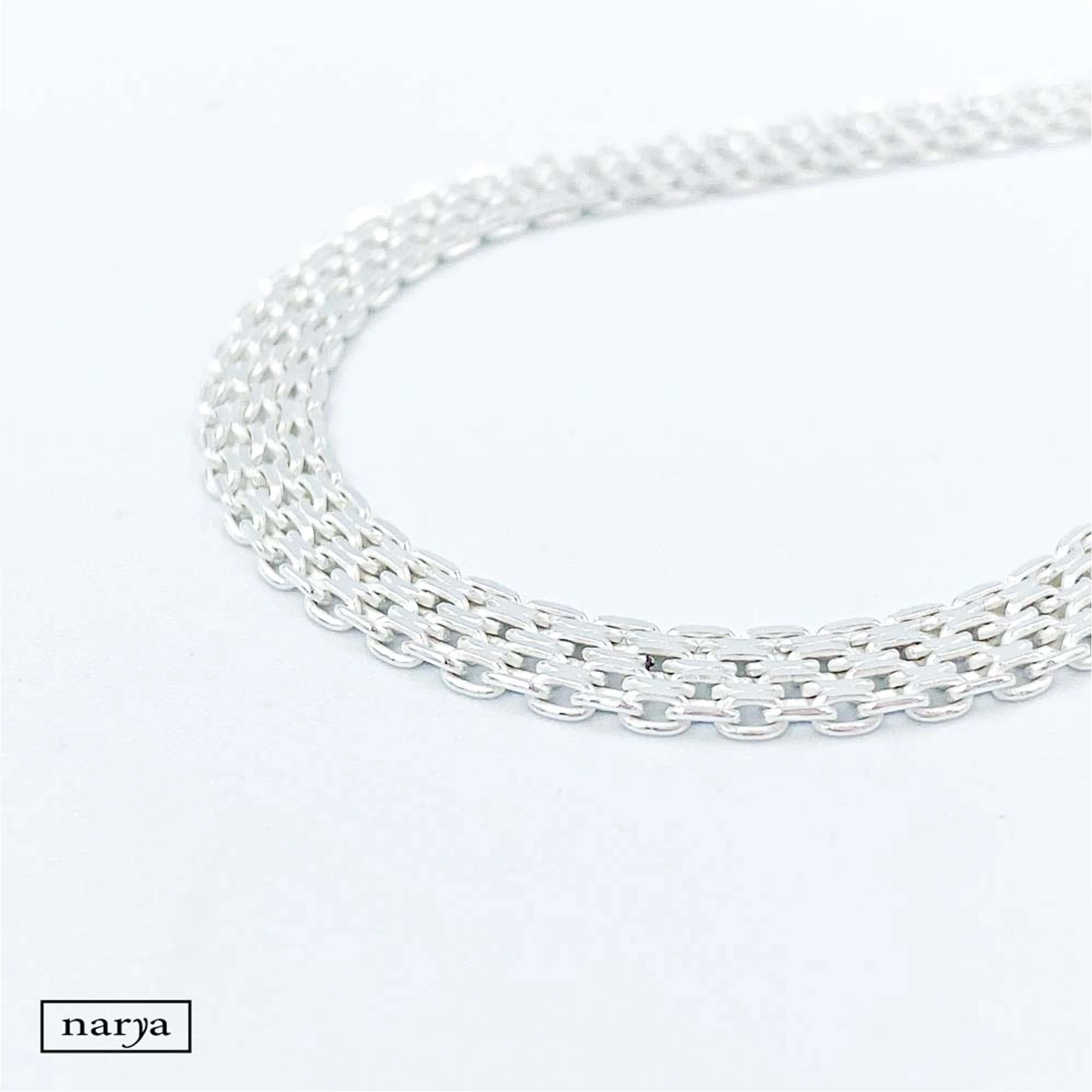 Mirtill ezüst ékszerünk egy lapos kialakítású, aprócska láncszemekből álló vastag karlánc, melynek a különlegessége, hogy az ezüst láncszemek egymásba kapaszkodva alakítják ki a lapos és vastag ékszer formát.