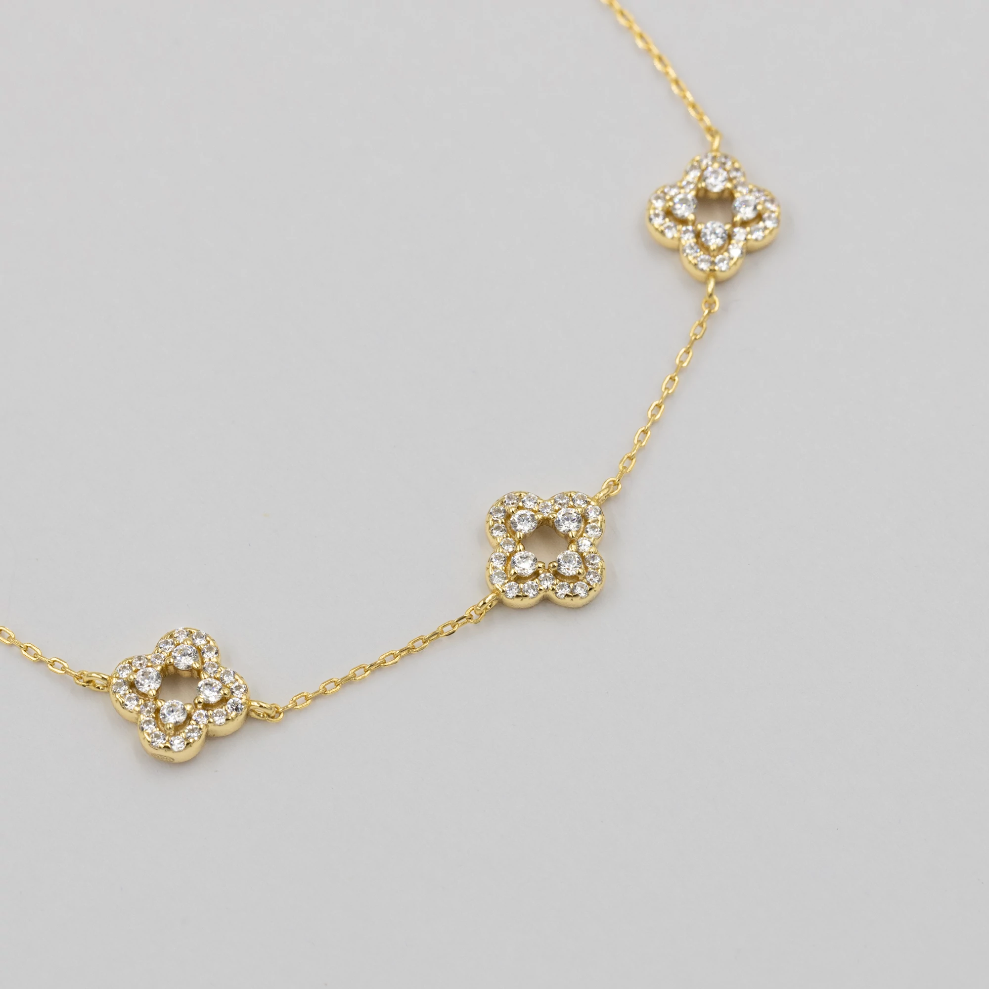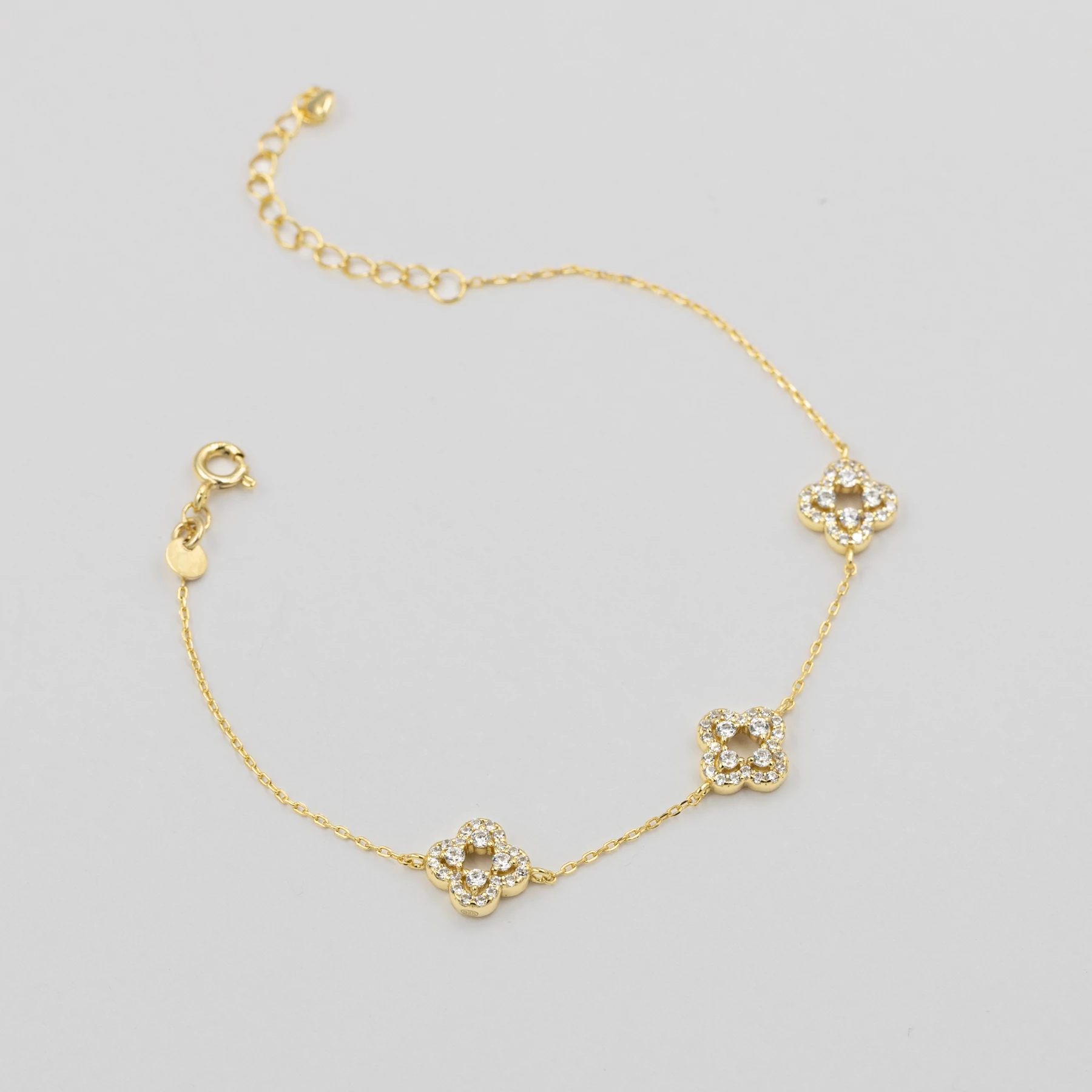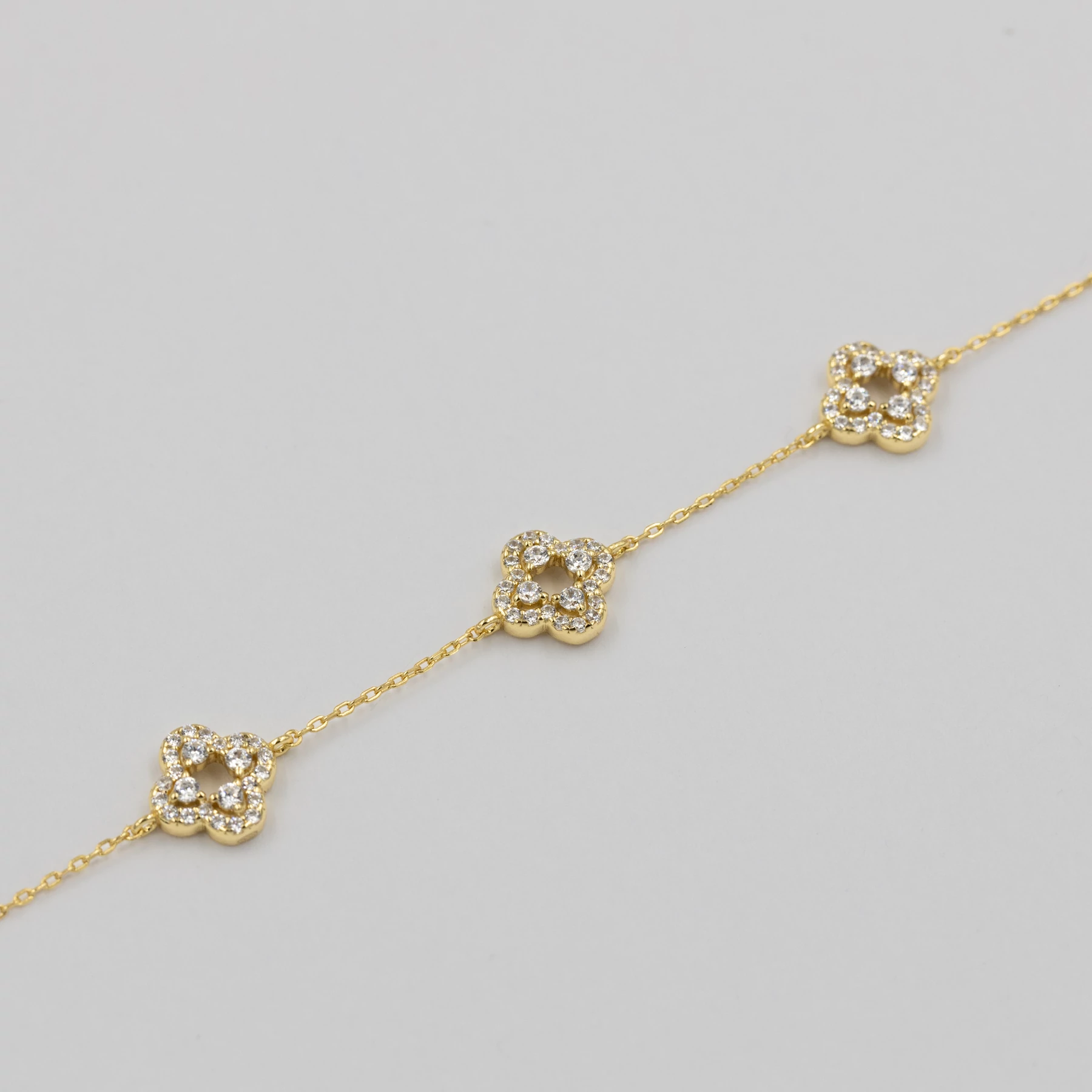 Stella ezüst karkötőnk egy aranyozott ékszer, melyet a rajta csillogó, aranyozott, négylevelű lóhere formájú, gyönyörű cirkónia kövekkel díszített medálok teszik igazán különlegessé. Ezüst, aranyozott Stella karláncunk nagyon letisztult, mégis tökéletesen megállja a helyét akár különleges alkalmakkor is.