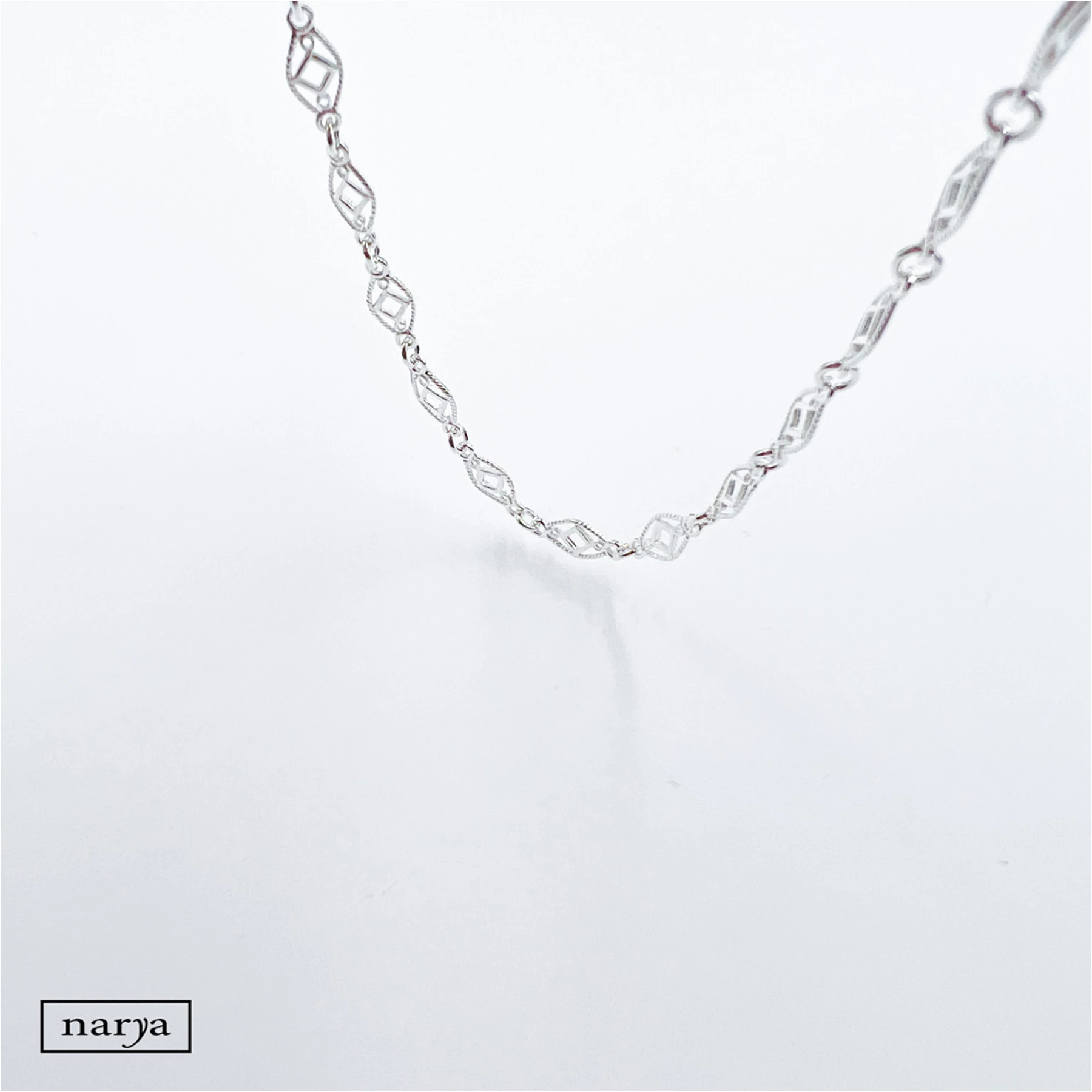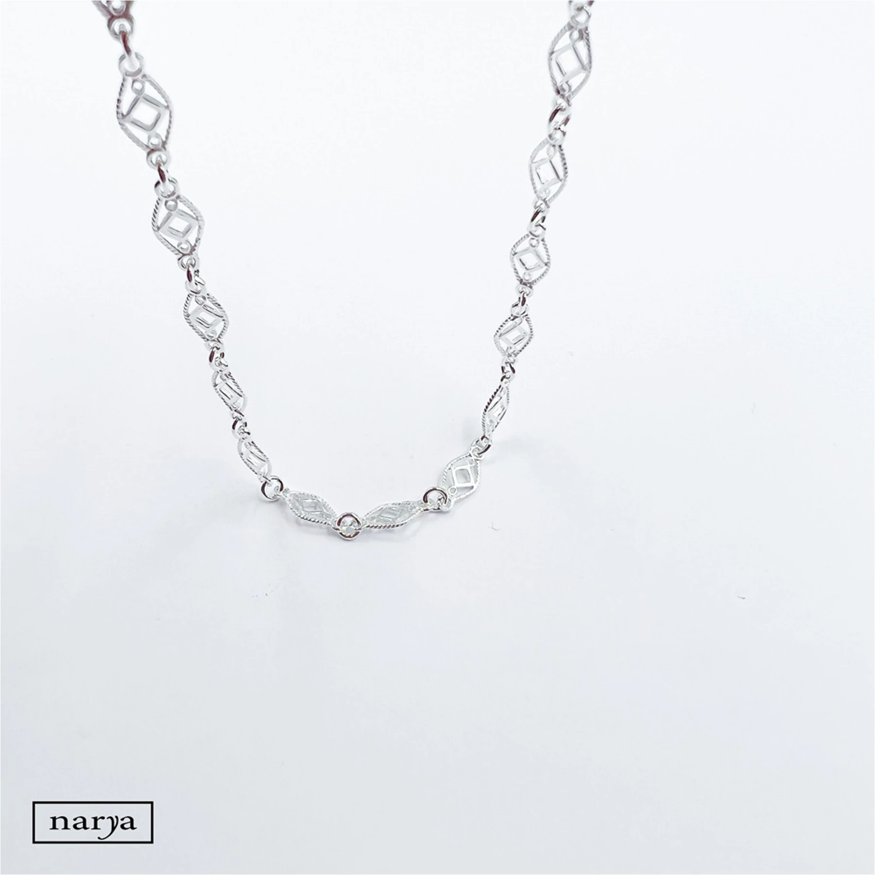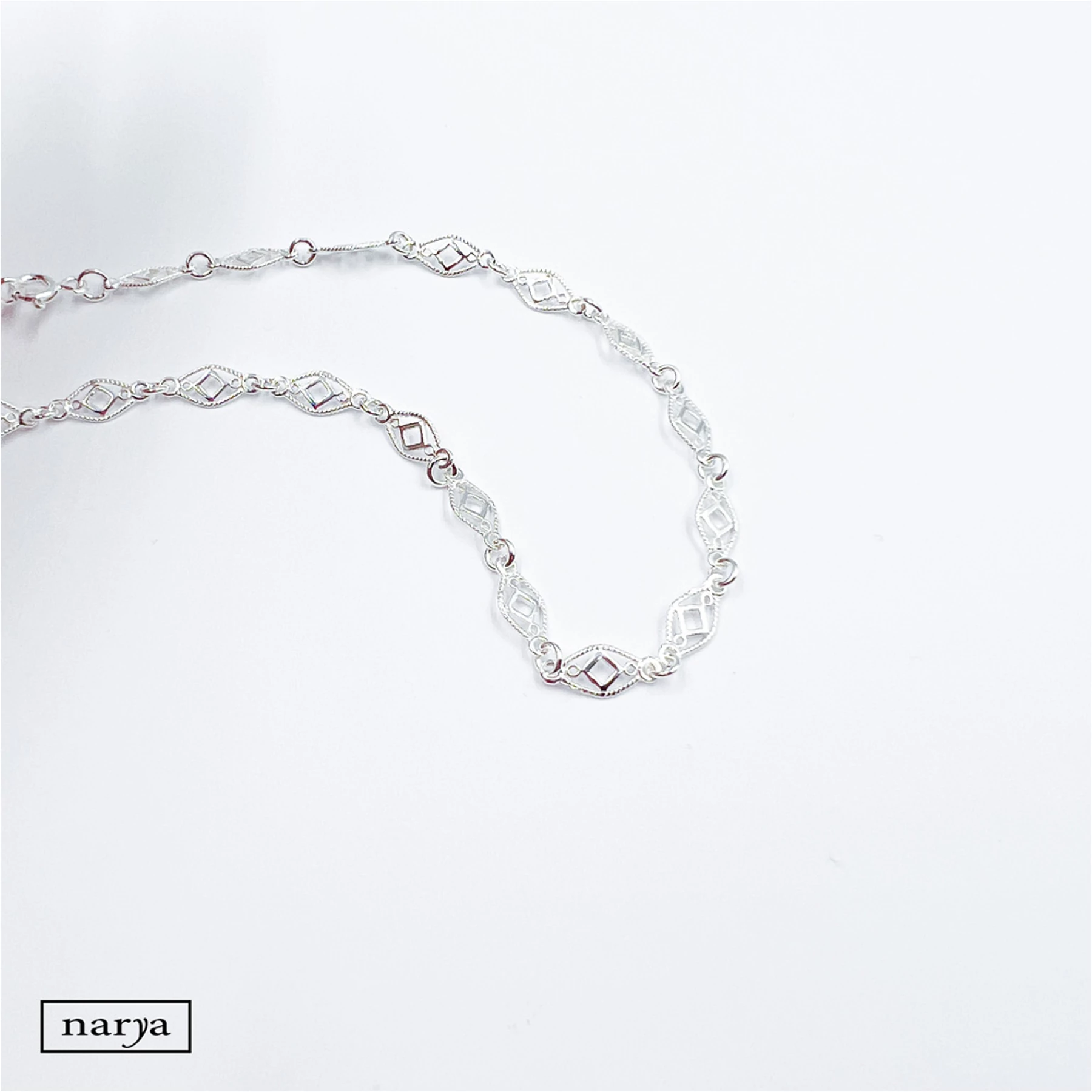 Száva ékszerünk egy gyönyörű, ezüst rombusz formákat ábrázoló bokalánc. Tökéletes viselet egy csodálatos nyári napon.